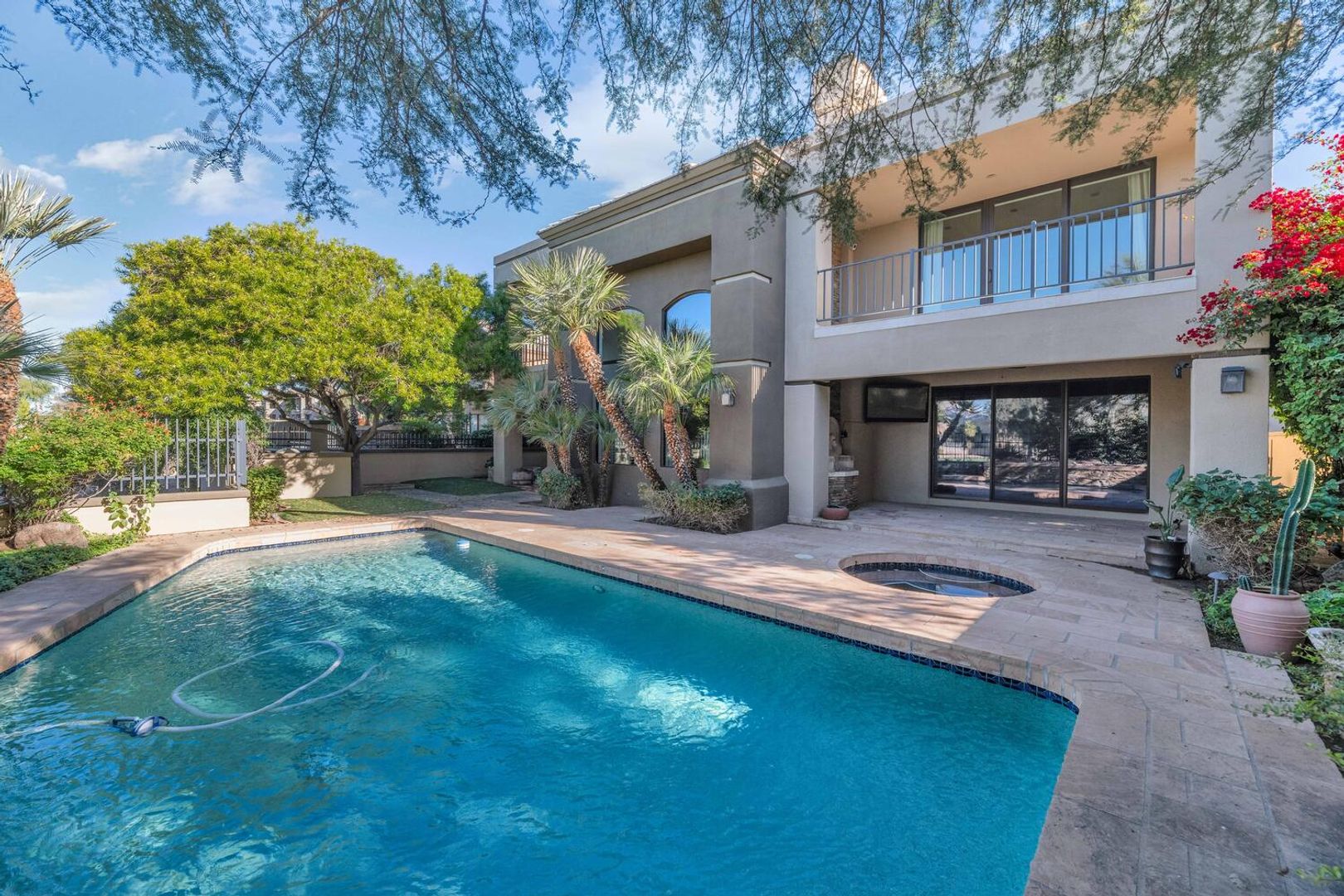 Discover the epitome of Gainey Ranch luxury in this exquisite 4-bedroom, 4.5-bathroom residence, perfectly positioned along the scenic Arroyo Golf Course with breathtaking fairway views. From the moment you arrive, the upgraded paver stone driveway and custom garage door set a tone of refined elegance. The main-level bedroom (ideal as a den or guest suite) features a beautifully carved stone fireplace, a fully remodeled en-suite bath, and a spacious walk-in closet. Entertain in style across the expansive great room with its convenient wet bar, elegant formal dining area, or cozy family room complete with a built-in entertainment center. The gourmet chef's kitchen boasts premium stainless steel appliances and custom cabinetry. Ascend to the serene upstairs retreat, where the luxurious master suite awaits - complete with a cozy built-in fireplace and a spa-like upgraded bath. Two additional en-suite bedrooms provide privacy and comfort for family or guests. Step outside to your private backyard paradise: a sparkling pool, relaxing spa, and meticulously lush landscaping create an oasis for year-round enjoyment. Embrace resort-style living in one of Scottsdale's most prestigious guard-gated communities. Residents enjoy exclusive access to the newly renovated Estate Club, featuring resort pools, a state-of-the-art fitness center, tennis and pickleball courts, scenic walking trails, and 24/7 security.