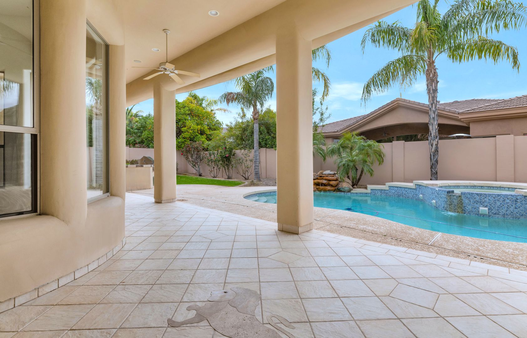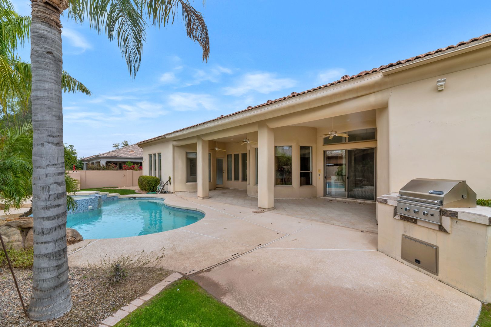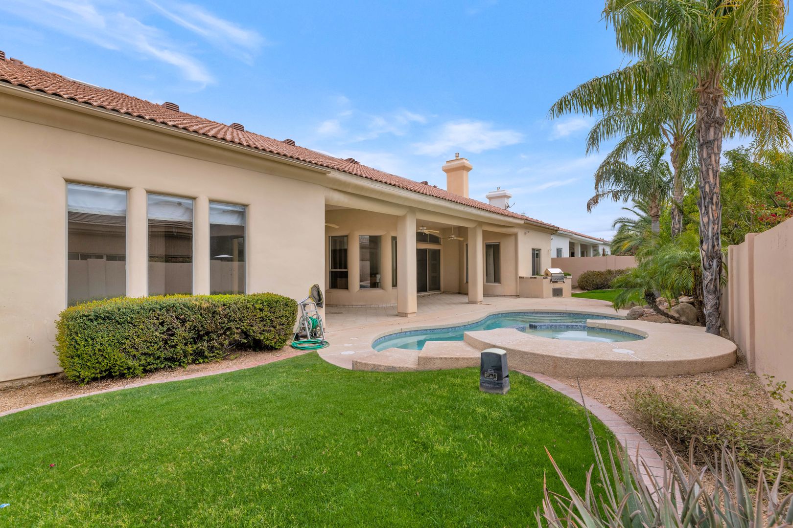 Full interior just repainted! Excellent Scottsdale location. IN GATED COMMUNITY. Home located at end in cul-de-sac, total privacy with all single level homes around and gated! Home has 4 private baths, one for each bedroom, custom granite kitchen with stainless steel appliances, alder cabinets, 20' vaulted ceilings, travertine tile in all the right places, custom interior paint, 2 car garage plus extra storage area, soft water, beautifully fenced saltwater pool which will be professionally maintained monthly, security system that can be activated by tenant.