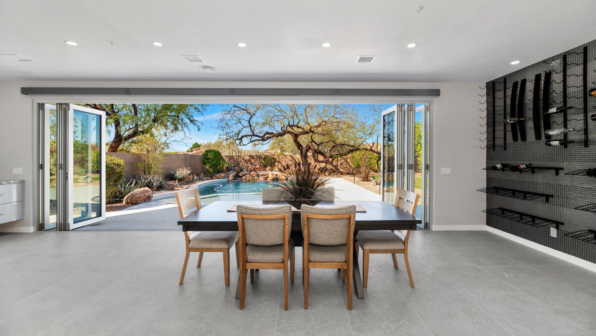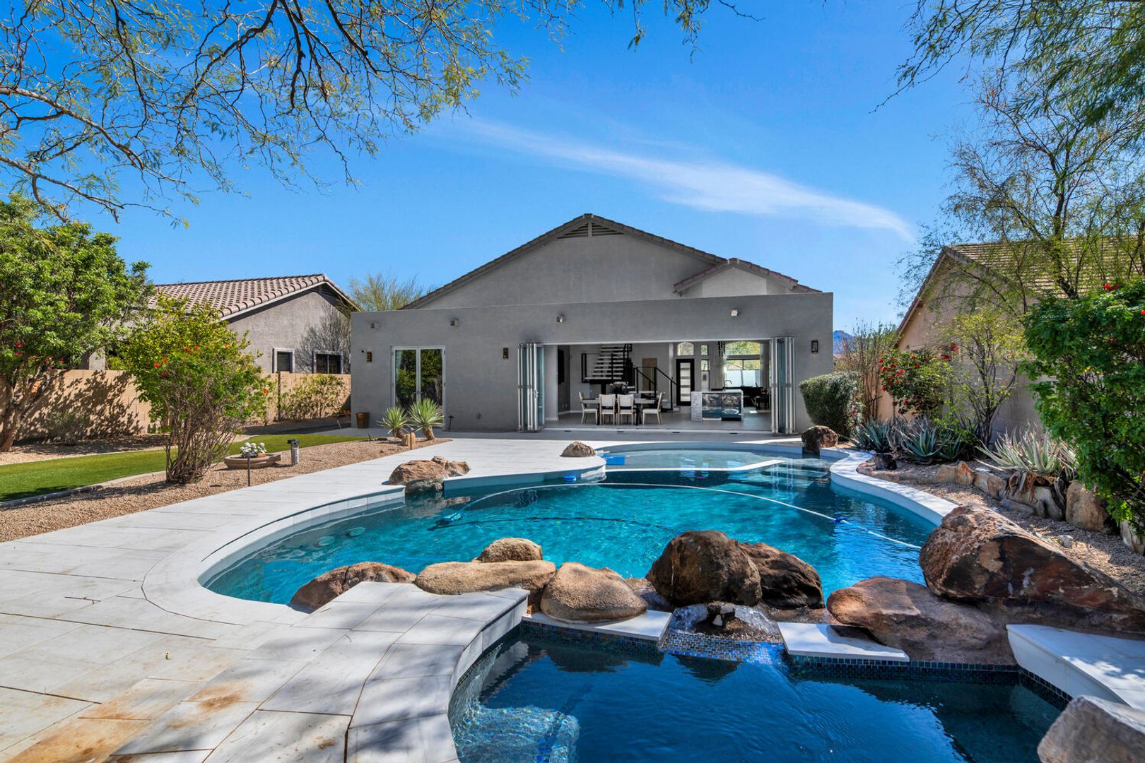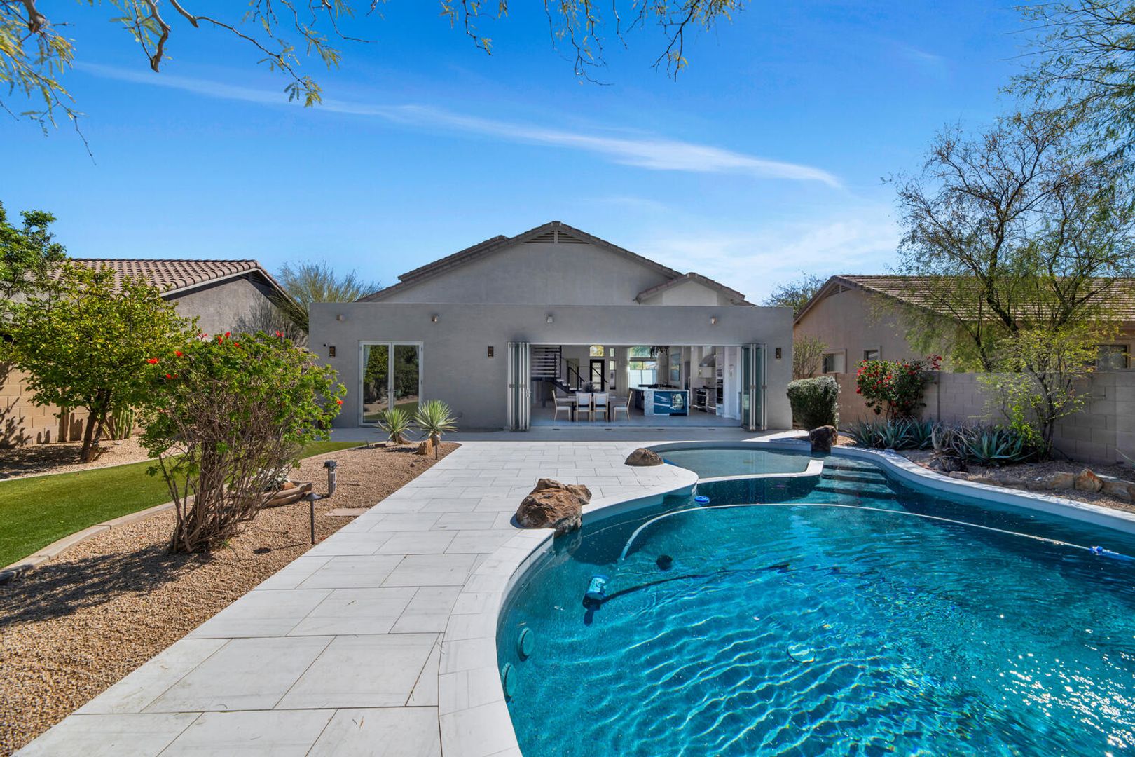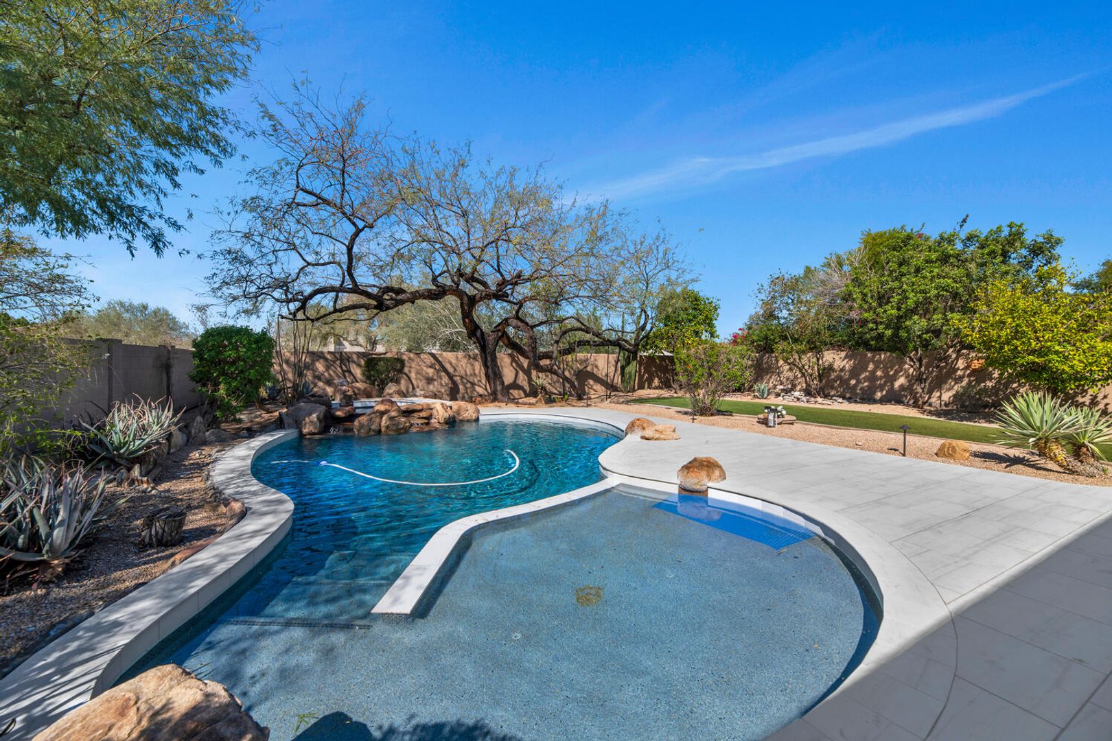 Upstairs, one bedroom offers breathtaking views of Pinnacle Peak and Tom's Thumb. Outside, the expansive rear yard is an entertainer's dream, complete with a newly upgraded heated pool and spa, pebble-tech decking, and custom backyard lighting illuminating the trees. With no homes directly behind or in front, this exceptional property faces a picturesque greenbelt, offering a serene and private oasis. The garage boasts a new protective-coated, pebble-tech floor, and the home can be secured with an ADT security system featuring multiple cameras. Every detail, from the anti-fog mirrors throughout to the blackout drapes in the bedrooms, reflects designer elegance and modern functionality in this extraordinary Grayhawk gem.