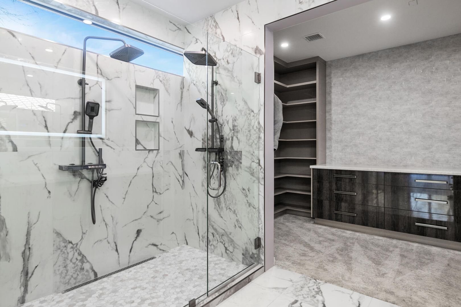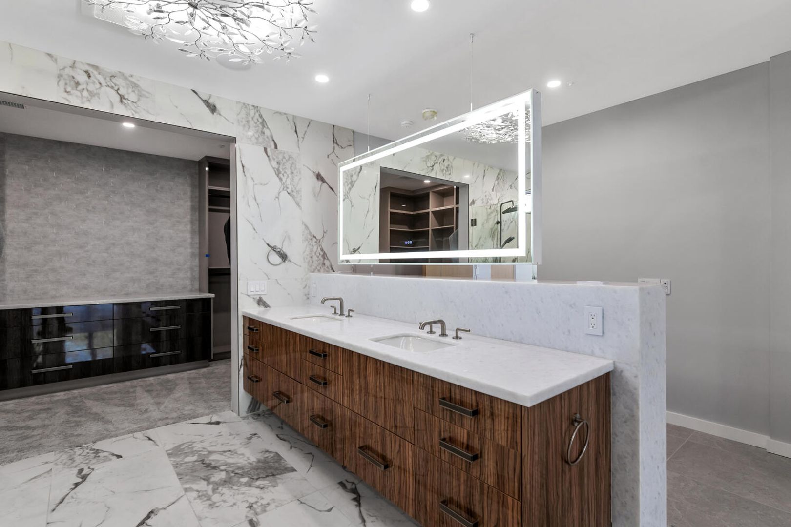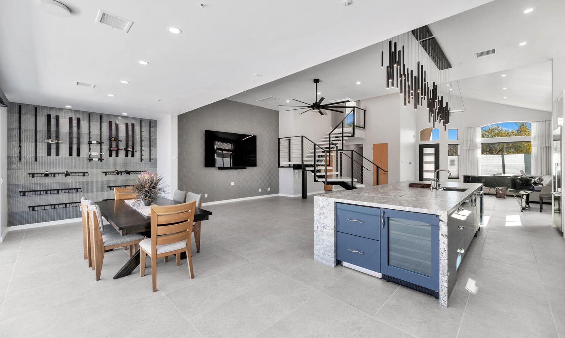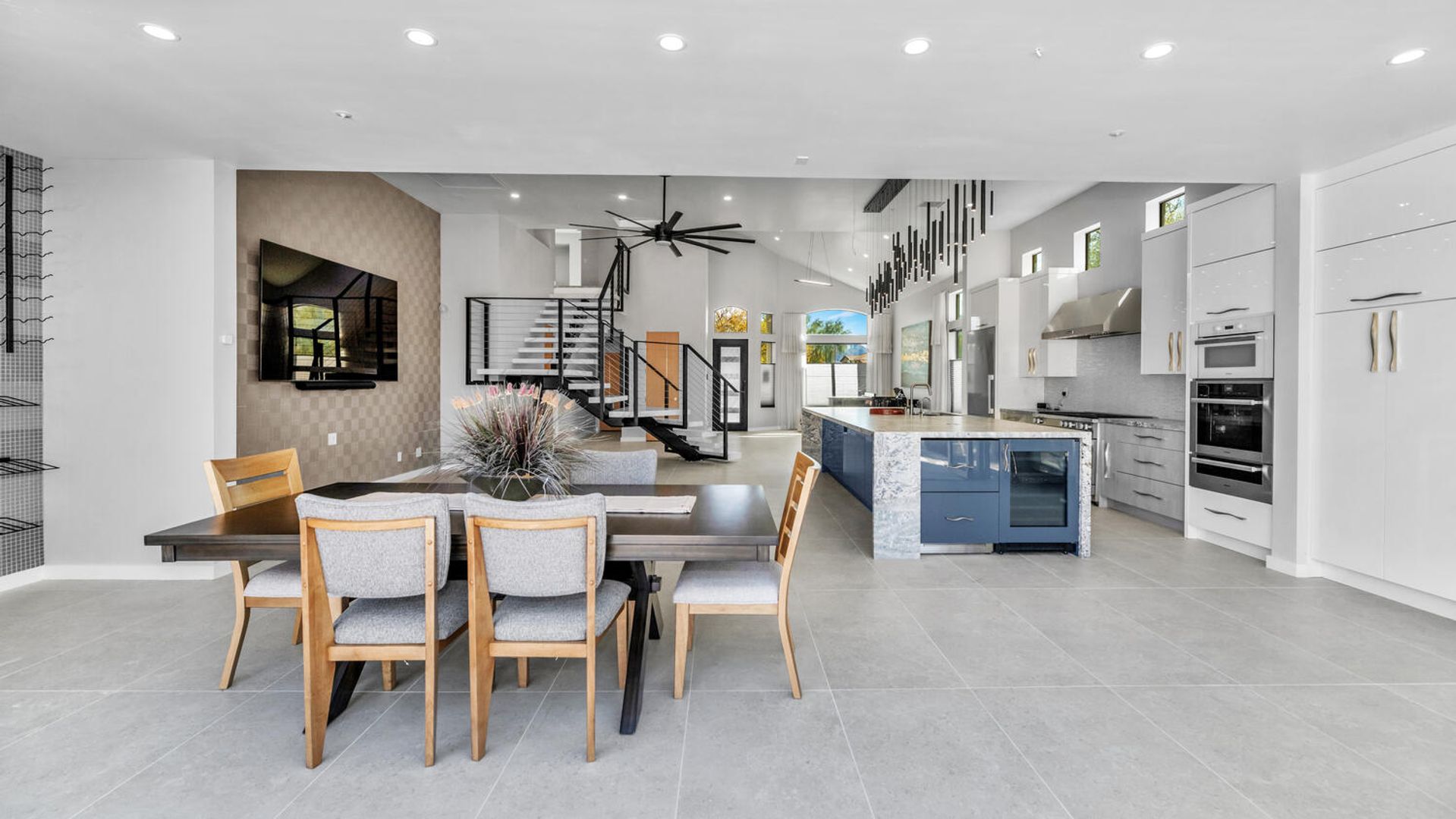 cabinetry, sleek stainless steel finishes, and elegant tile flooring. The oversized 5-foot-wide island seats eight and includes four custom refrigerated drawers and a wine cooler, perfect for entertaining. A stunning wine wall adds a touch of sophistication to the space. Retreat to the downstairs master suite, featuring a luxurious separate tub, a spacious walk-in shower with stylish tile surrounds, designer blackout curtains, and anti-fog mirrors for ultimate convenience.