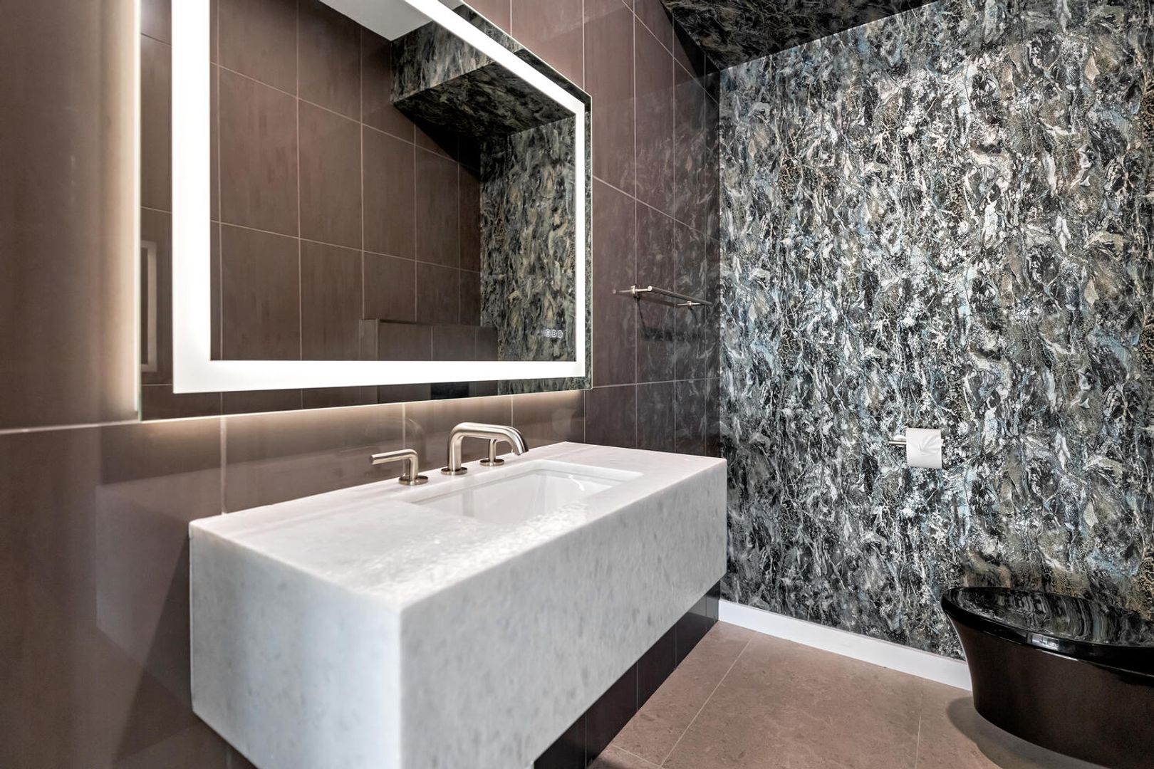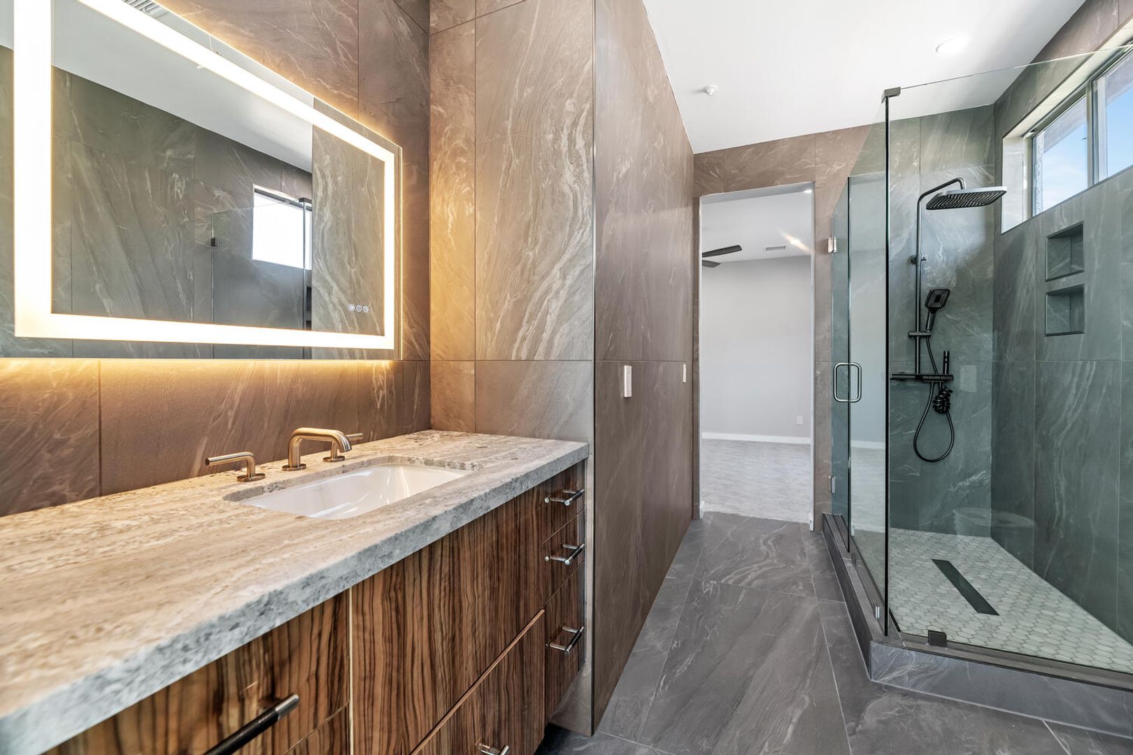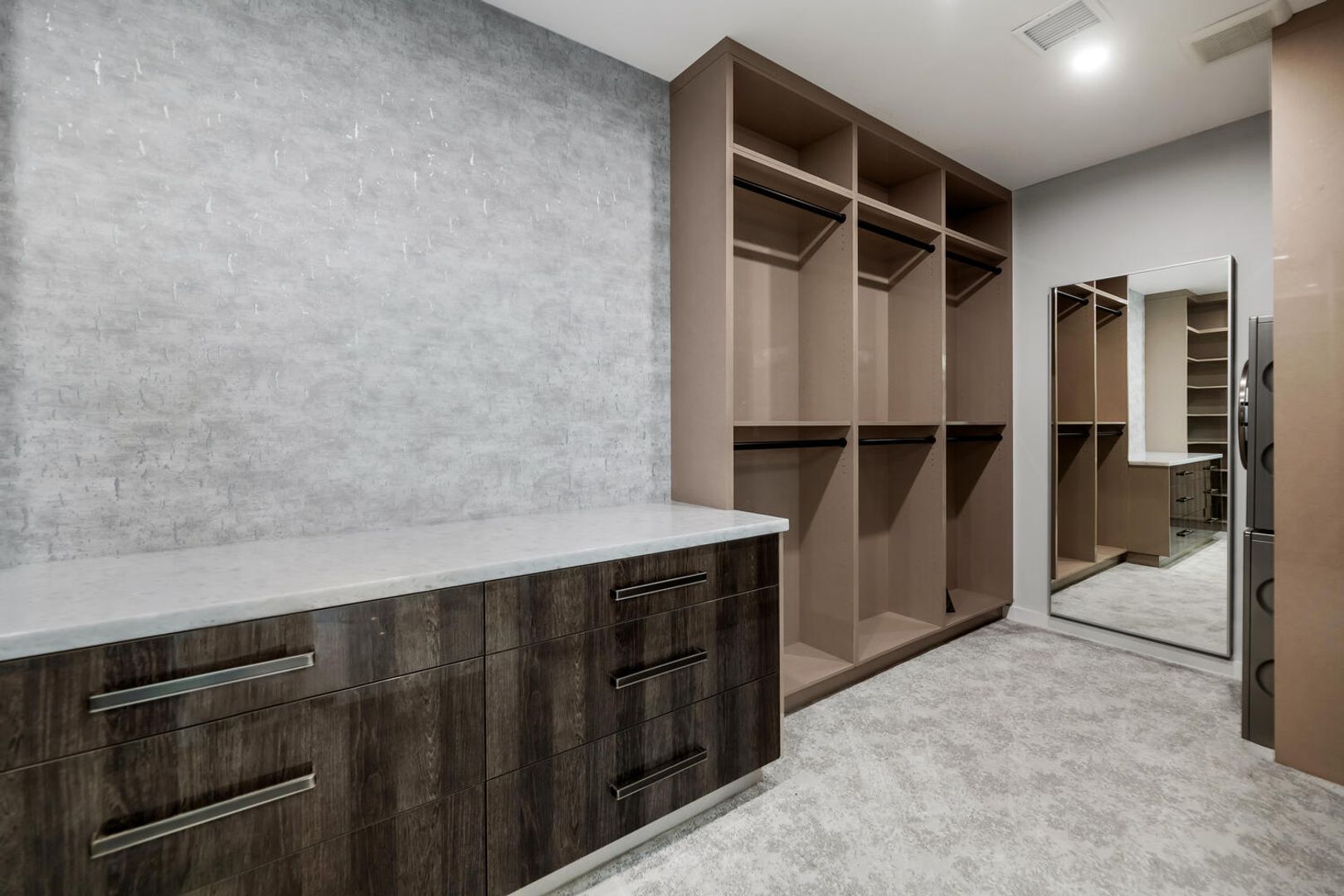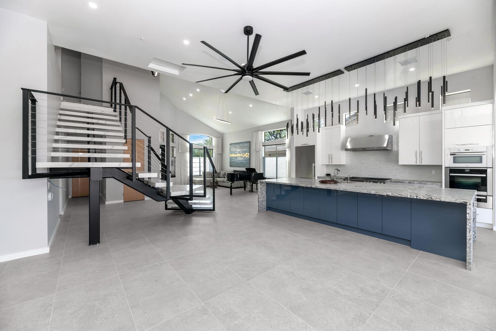 cabinetry, sleek stainless steel finishes, and elegant tile flooring. The oversized 5-foot-wide island seats eight and includes four custom refrigerated drawers and a wine cooler, perfect for entertaining. A stunning wine wall adds a touch of sophistication to the space. Retreat to the downstairs master suite, featuring a luxurious separate tub, a spacious walk-in shower with stylish tile surrounds, designer blackout curtains, and anti-fog mirrors for ultimate convenience.