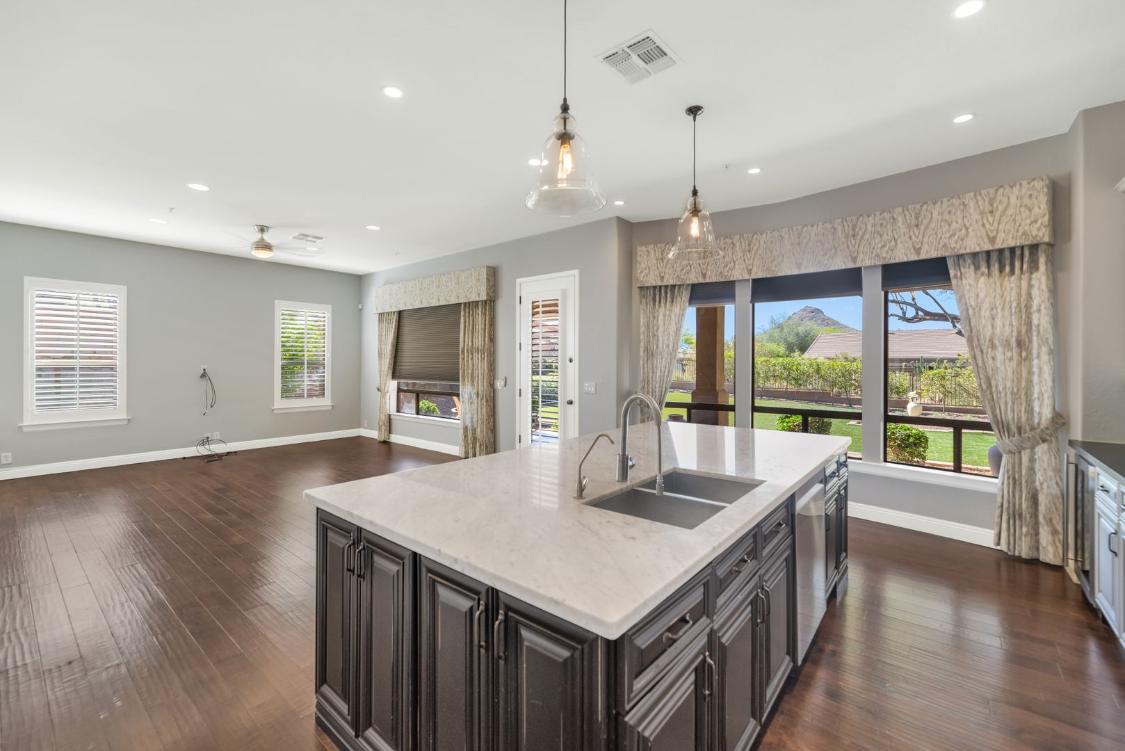 Pottery Barn Perfect! Truly an Incredible Remodel that looks like it is ready for the next cover of Phoenix Home and Garden Magazine. Designed for the Discerning buyer with no detail left out in this 4Br, 2Ba, 3 Car Garage home! The Chefs Kitchen is an Entertainers Dream boasting a Huge Carrera Marble Island, Custom Cabinetry, Glass Subway Tiled Backsplash, and Premium Stainless Appliances. The Large master suite offers a Spa Inspired bathroom featuring a Honed marble shower with Seamless Glass, a Granite double vanity, and a Freestanding Tub with a Classic floor mounted faucet, topped with the Perfect Chandelier! Out back you will find your own private Oasis with Mountain Views, Lush Green grass, Two Separate Sitting areas and Shade provided by a Mature Mesquite Tree! MUST SEE!