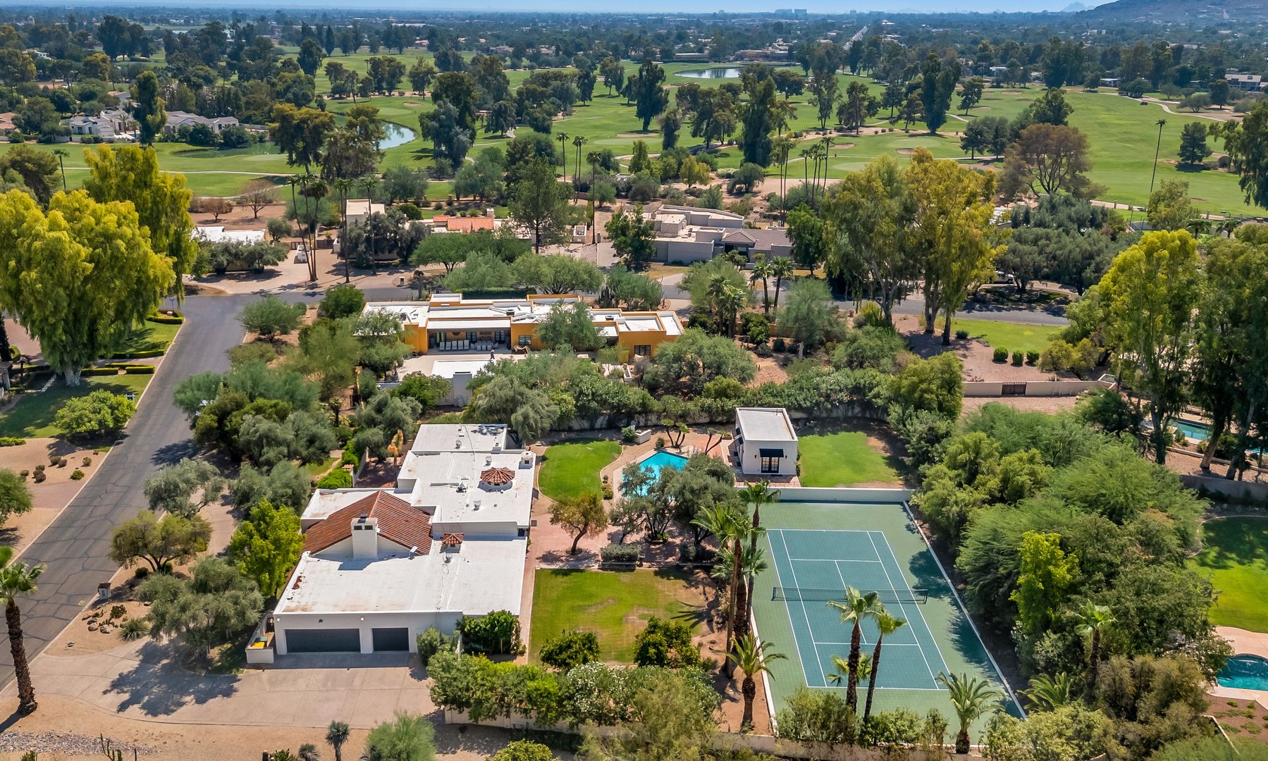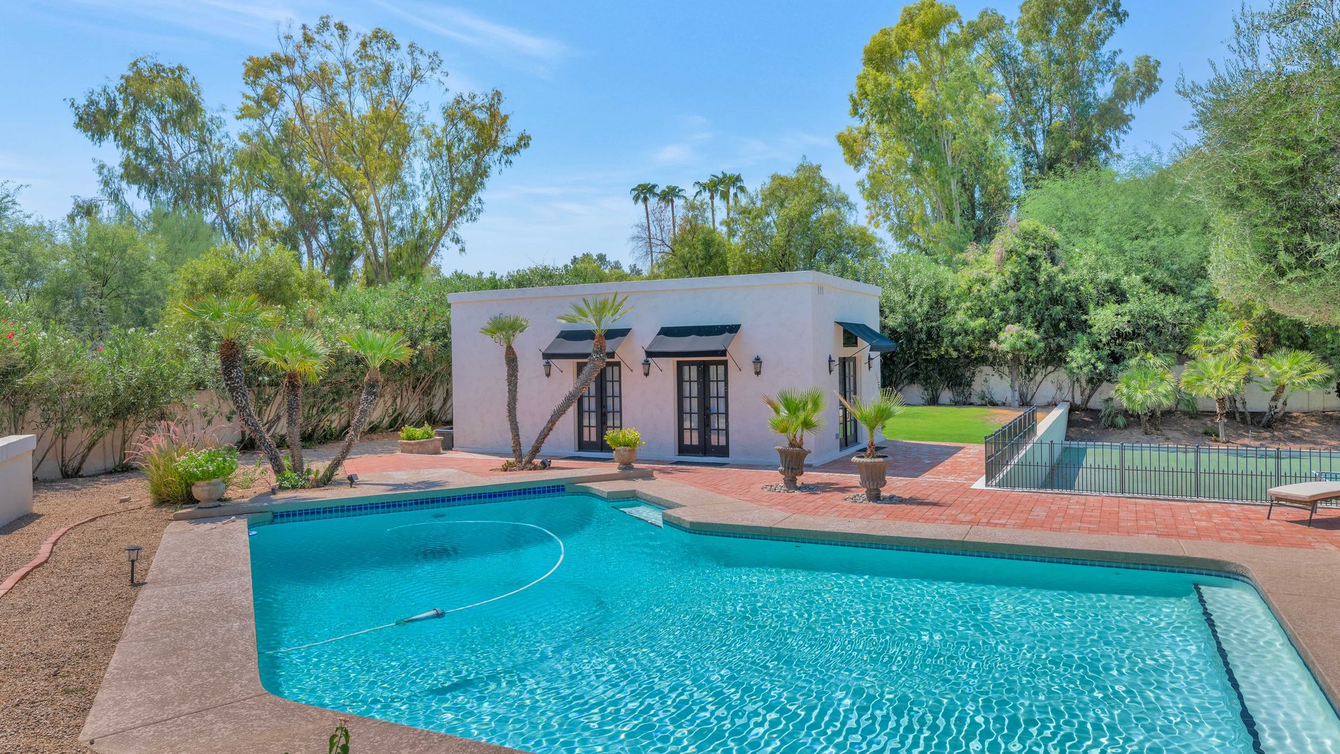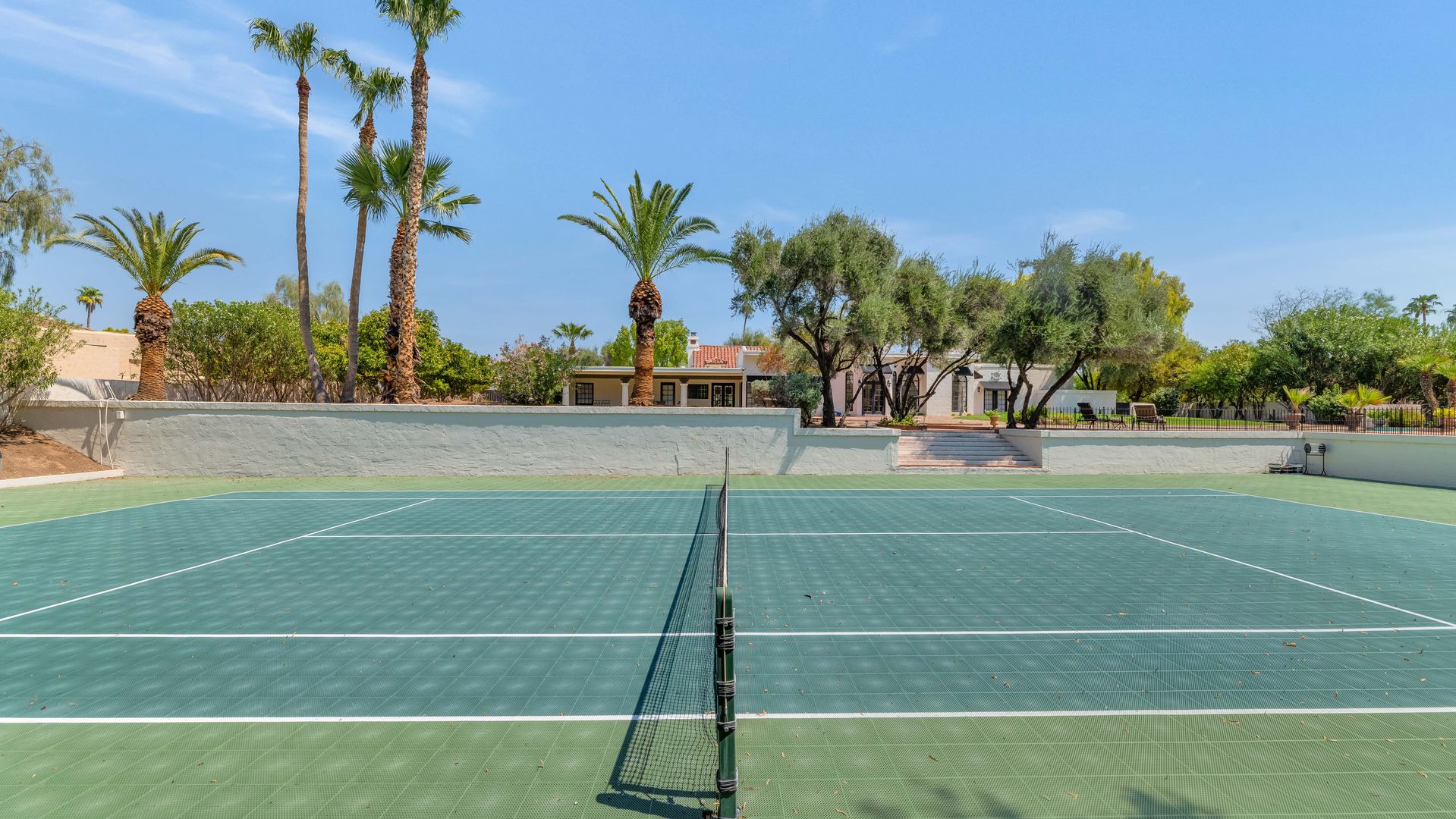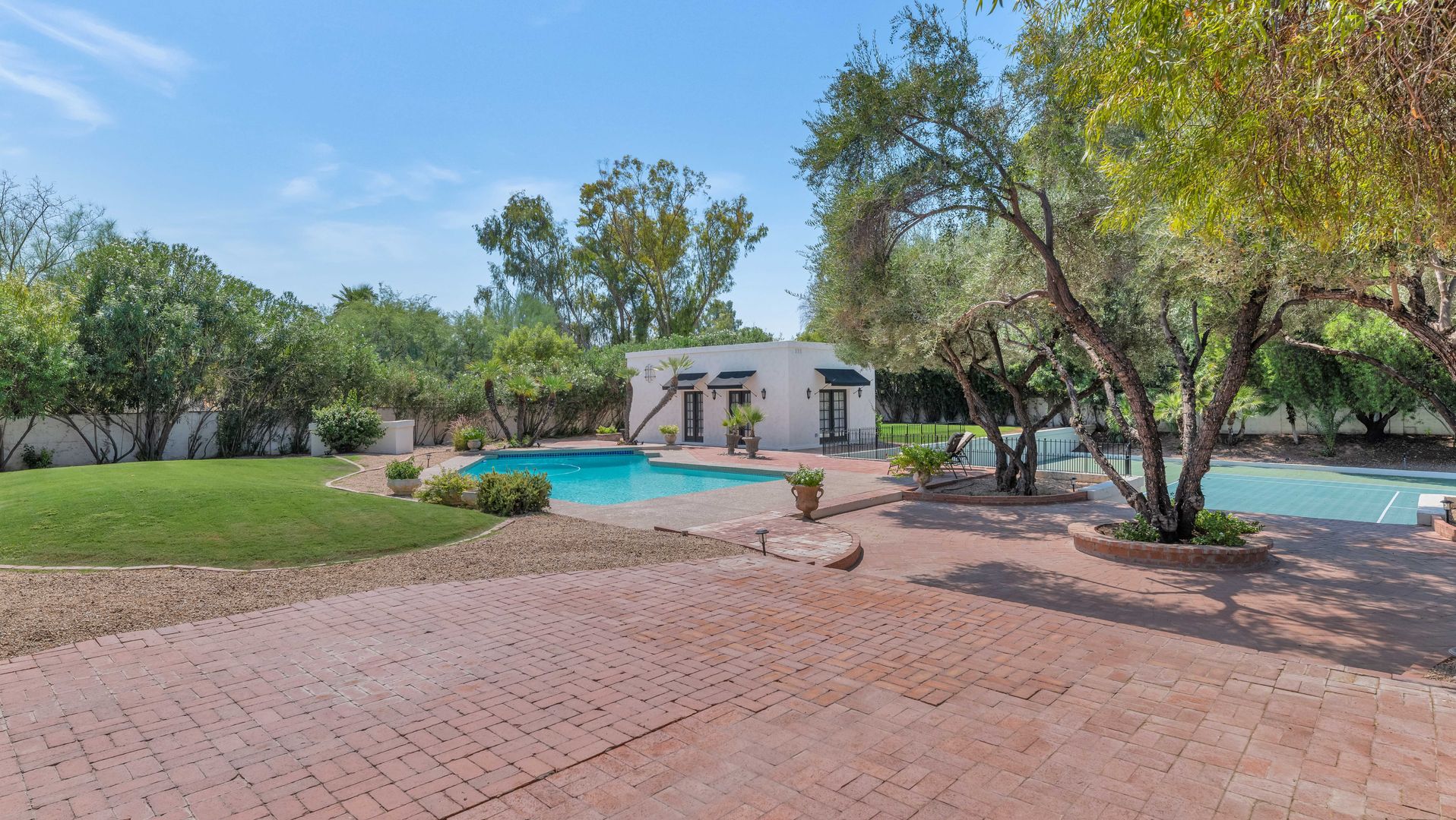 Tucked away in the prestigious Camelback Country Club Estates, this stunning residence is a sanctuary of elegance, enveloped by lush landscaping and mature trees that ensure ultimate privacy and serenity. The expansive layout effortlessly balances relaxation and entertainment, featuring a sparkling pool and a charming guest house. Step inside to a harmonious blend of timeless charm, with soaring ceilings, authentic Saltillo tile floors, and an abundance of natural light. The tranquil Master Suite, complete with a cozy adobe fireplace and private patio, offers a perfect retreat. The chef's kitchen is a culinary dream, equipped with top-tier appliances and breathtaking views of the lush backyard. Outdoors, a pristine pool and versatile sports court create a true oasis for leisure and recreation. This home embodies luxury living, seamlessly blending classic architecture with exceptional amenities.