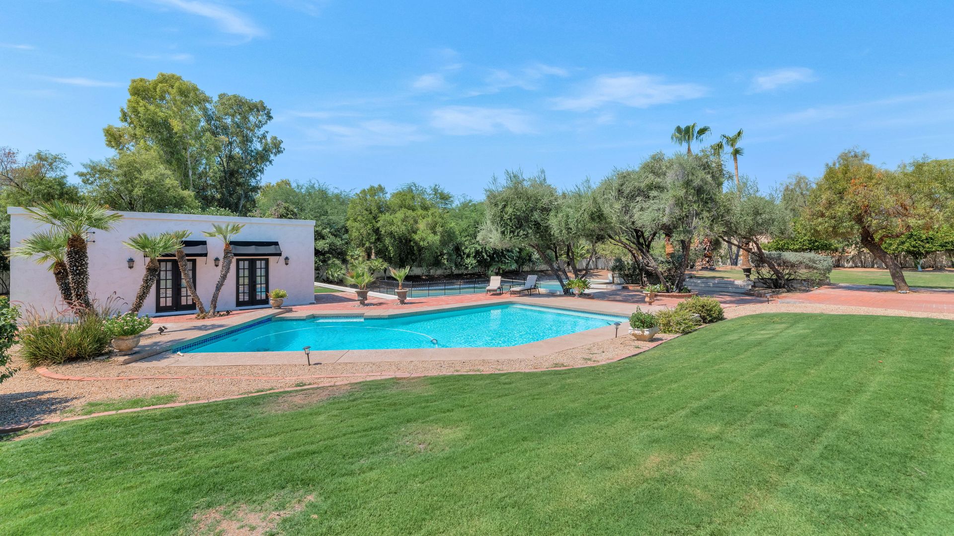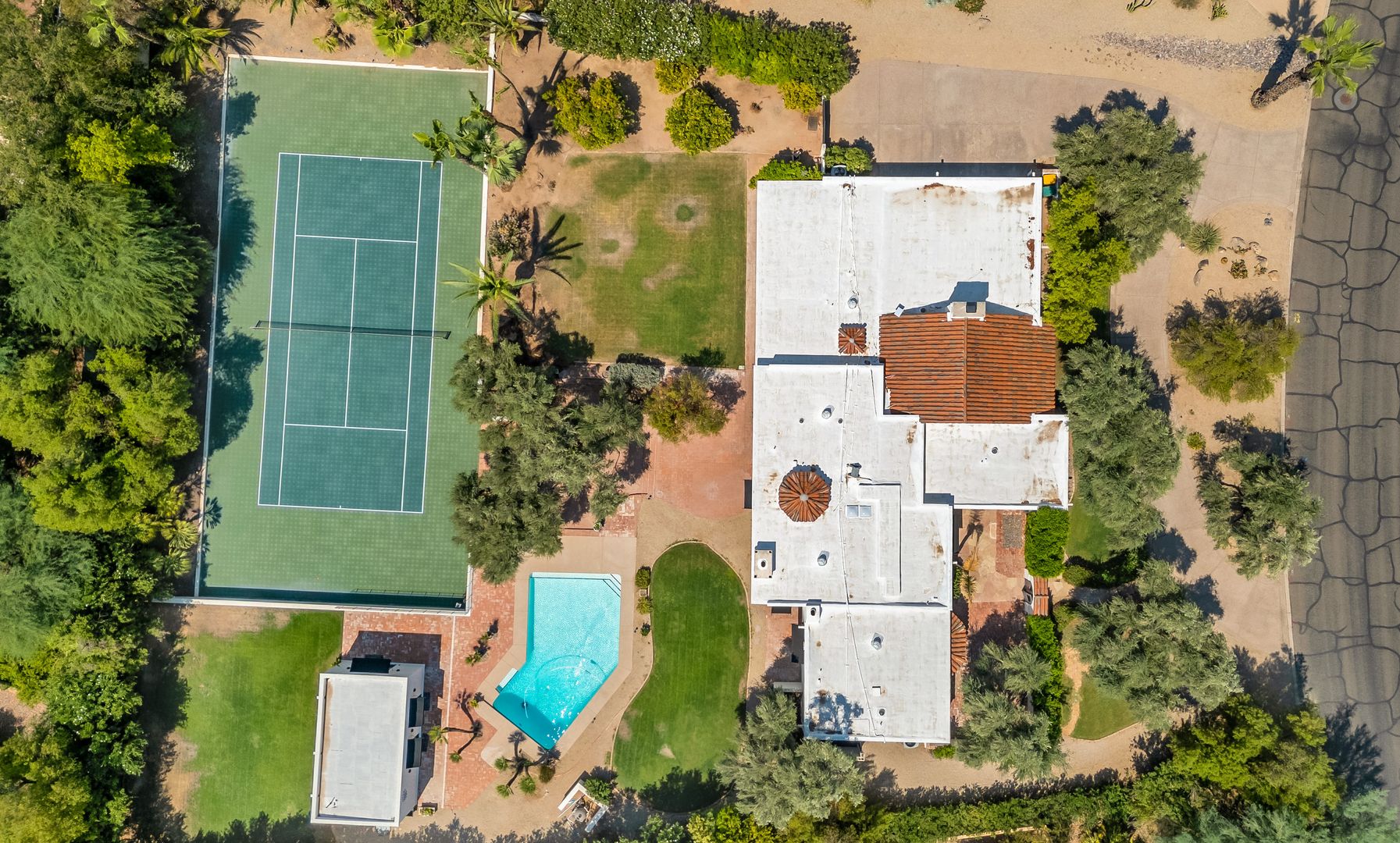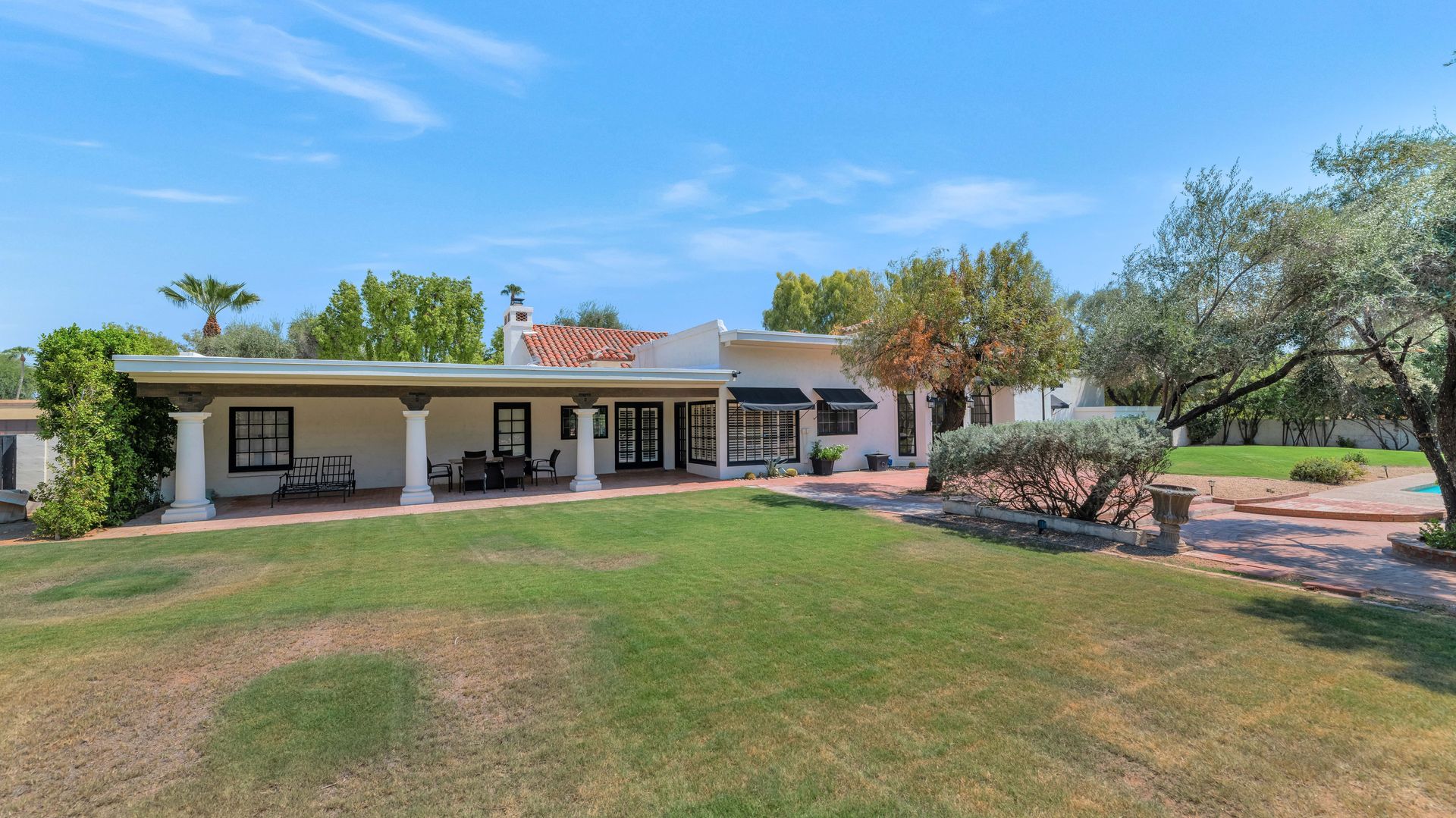 Tucked away in the prestigious Camelback Country Club Estates, this stunning residence is a sanctuary of elegance, enveloped by lush landscaping and mature trees that ensure ultimate privacy and serenity. The expansive layout effortlessly balances relaxation and entertainment, featuring a sparkling pool and a charming guest house. Step inside to a harmonious blend of timeless charm, with soaring ceilings, authentic Saltillo tile floors, and an abundance of natural light. The tranquil Master Suite, complete with a cozy adobe fireplace and private patio, offers a perfect retreat. The chef's kitchen is a culinary dream, equipped with top-tier appliances and breathtaking views of the lush backyard. Outdoors, a pristine pool and versatile sports court create a true oasis for leisure and recreation. This home embodies luxury living, seamlessly blending classic architecture with exceptional amenities.