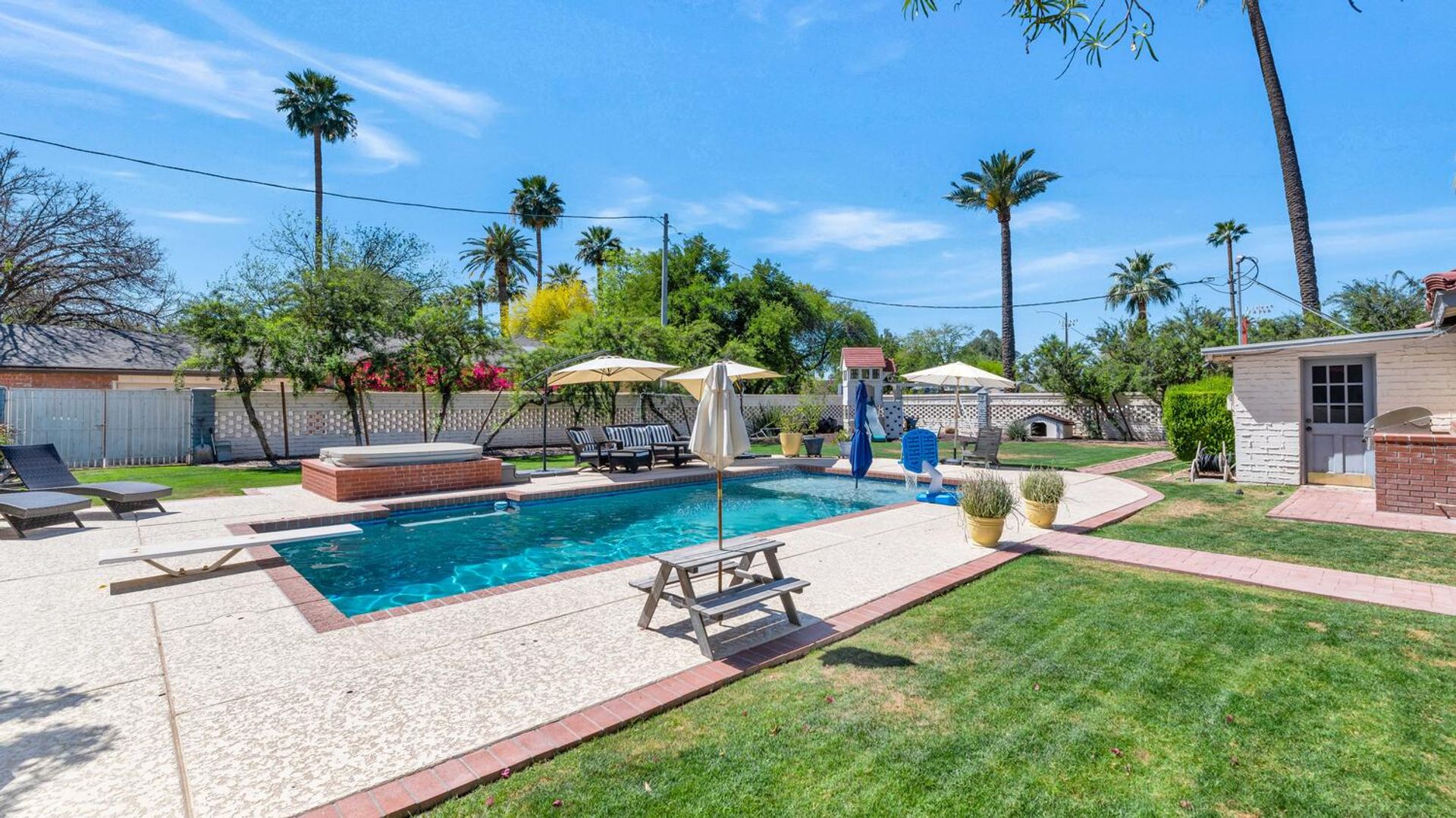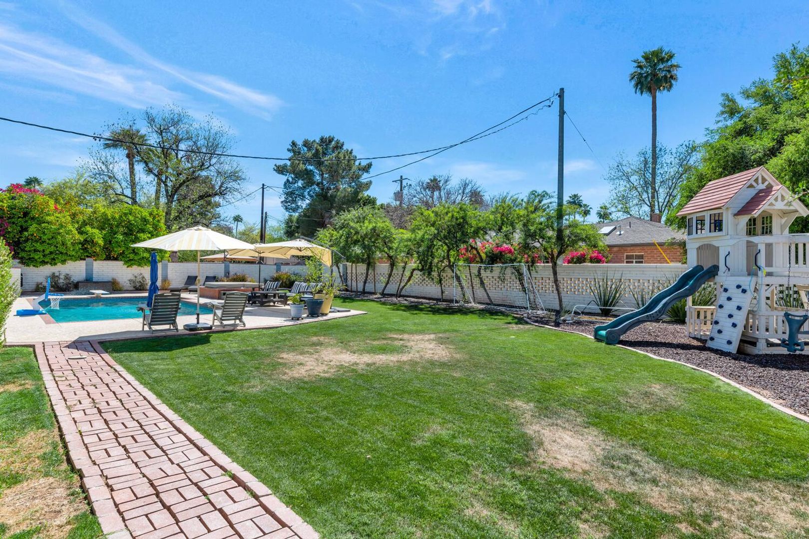 Lush, green, and refreshingly cool, Encanto Palmcroft is one of Phoenix’s most desirable historic neighborhoods. This beautifully updated Monterey Colonial Revival home was designed by renowned architects Eckman & Gilmore and custom-built in 1940. Nestled on a professionally landscaped corner lot, the home enjoys stunning views overlooking the iconic Encanto Park Golf Course. The thoughtfully designed floor plan offers flexibility and comfort, featuring two bedrooms and two bathrooms on the main level and two additional bedrooms with two baths upstairs. A spacious media/game room with a dedicated workout area is found in the finished daylight basement. Outside, you’ll discover a private, resort-style backyard complete with a sparkling pool — perfect for relaxation and entertaining. Ideally located, the home is just minutes from downtown Phoenix, Arizona State offices, Banner Health, and St. Joseph’s Medical Centers, with easy access to major freeways. This rare historic gem offers the perfect blend of timeless charm, modern living, and an enviable lifestyle with a dramatically shorter commute.