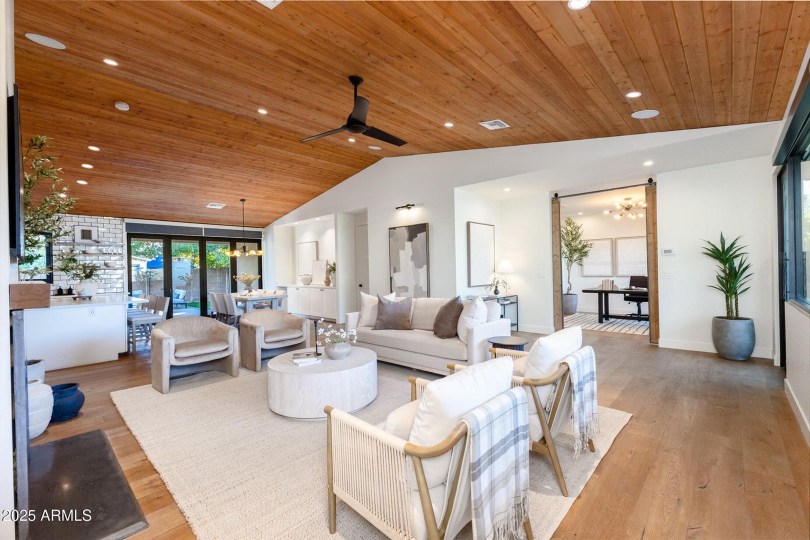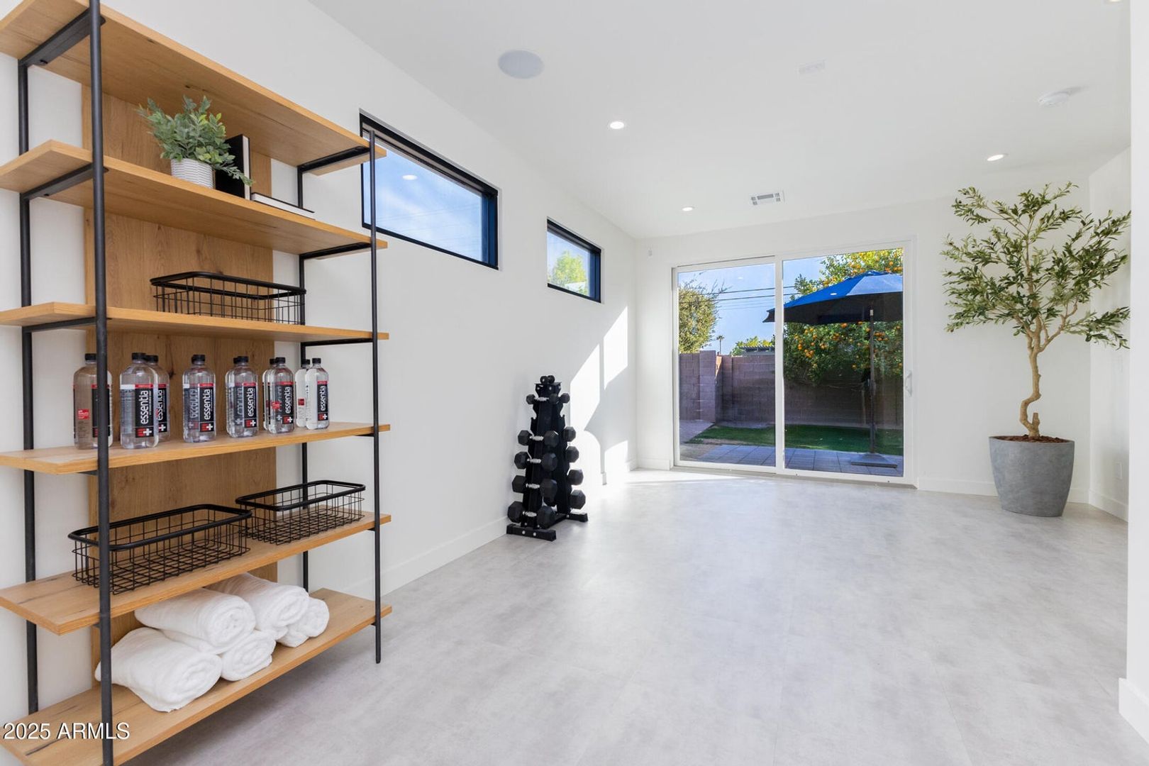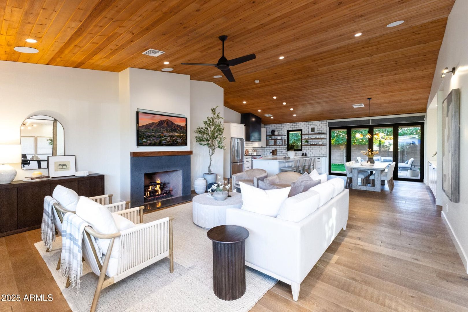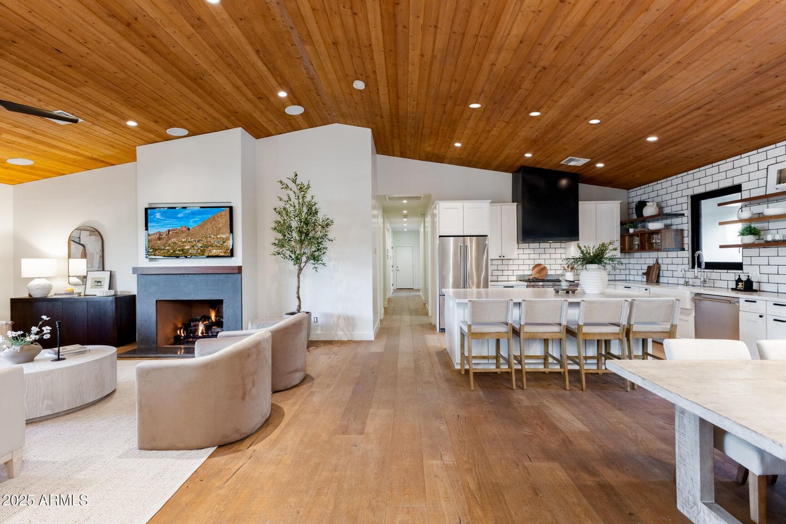Nestled in the vibrant Camelback Corridor, this stunning 2,855 square-foot custom home, built in 2015, offers unparalleled access to the Valley's finest dining, shopping, and outdoor adventures. This four-bedroom, three-bathroom residence, complete with a dedicated gym and separate office/den, blends modern elegance with functional design. Step inside to discover an open-concept layout with soaring rough-sawn tongue-and-groove ceilings, wide-plank oak floors, and a cozy gas fireplace, creating an inviting ambiance perfect for both intimate gatherings and lively entertaining. The gourmet kitchen, a chef's dream, boasts custom cabinetry, a premium Wolf gas range, and a spacious island that effortlessly connects to the living area, ideal for seamless modern living. The master suite is a serene retreat, featuring a luxurious en-suite bathroom with a soaking tub, walk-in shower, dual vanities, and custom solid walnut cabinetry paired with premium Grohe fixtures for a touch of timeless sophistication. Designed with energy efficiency in mind, the home features a sleek metal roof with foam insulation for durability and low maintenance. Outside, backyard is perfect for soaking up Arizona's sunshine or hosting memorable gatherings. This meticulously crafted home combines style, comfort, and practicality in one extraordinary package.