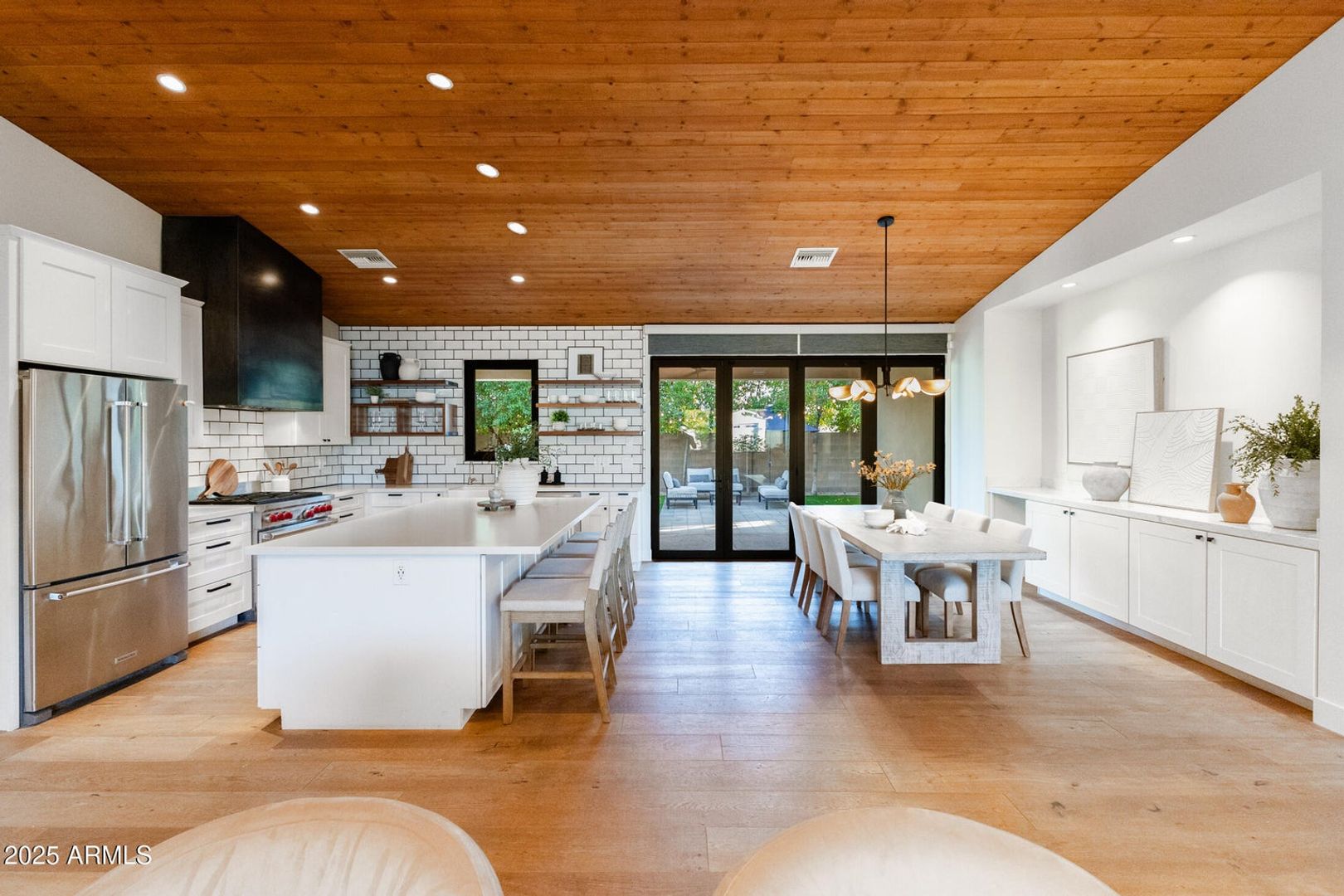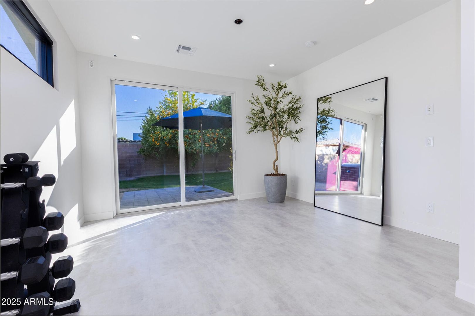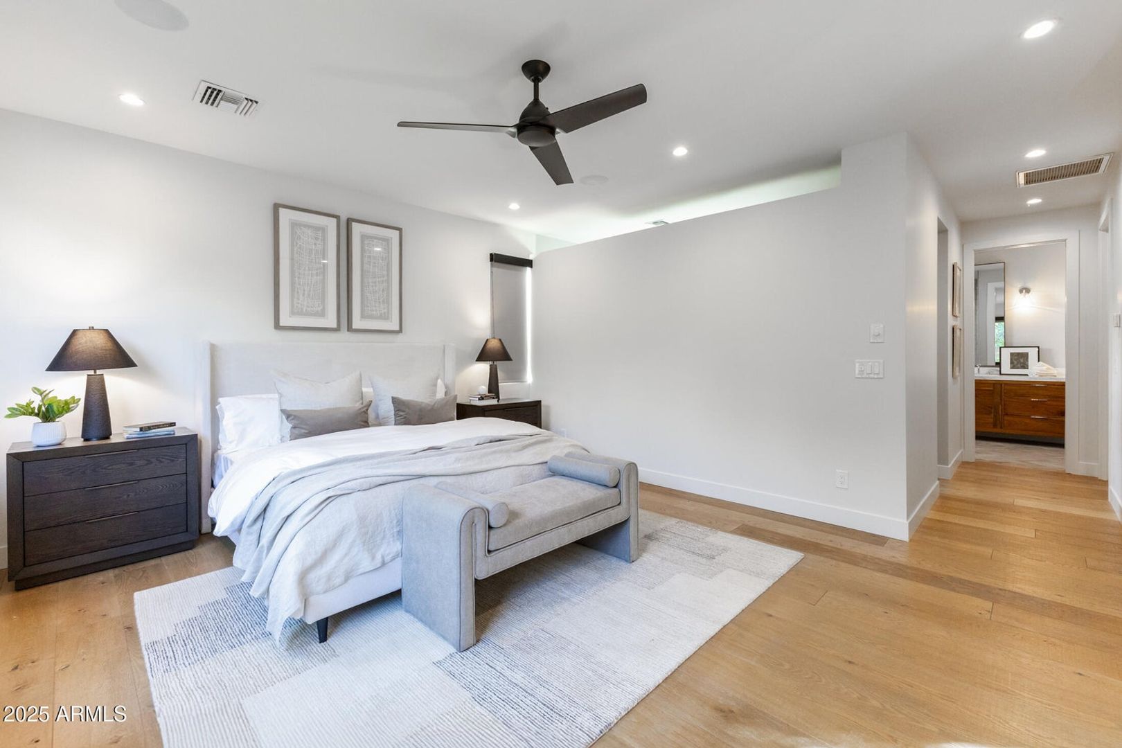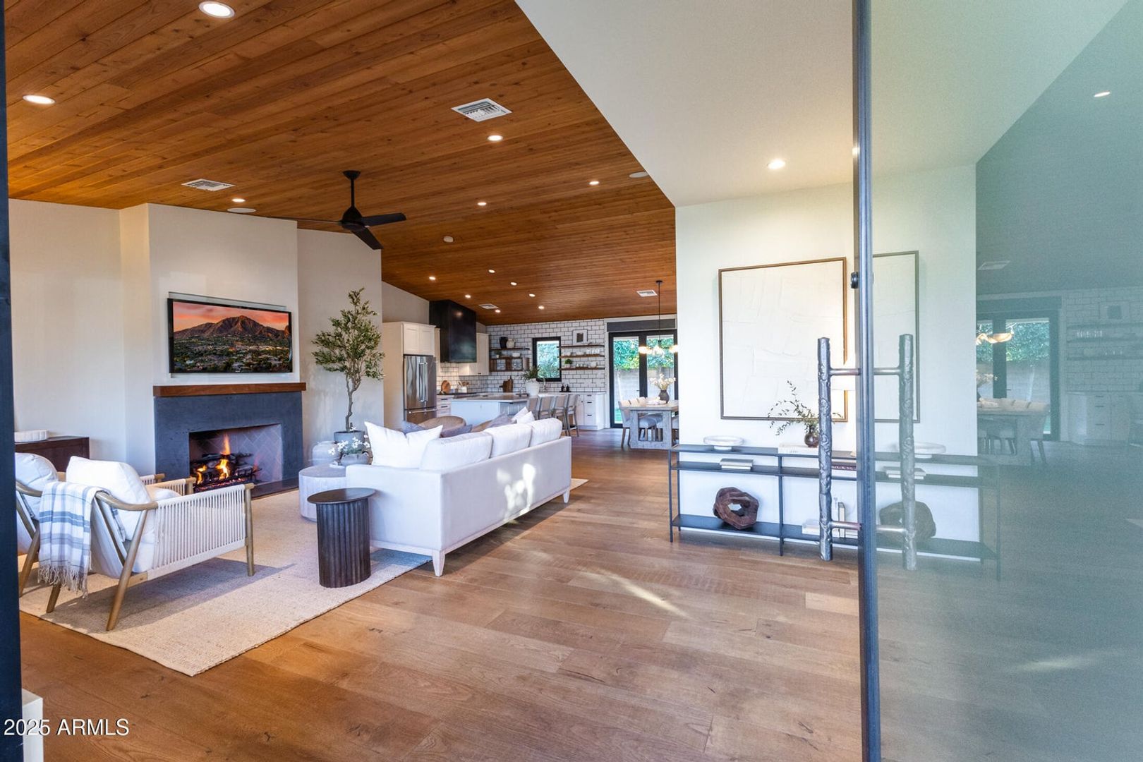Nestled in the vibrant Camelback Corridor, this stunning 2,855 square-foot custom home, built in 2015, offers unparalleled access to the Valley's finest dining, shopping, and outdoor adventures. This four-bedroom, three-bathroom residence, complete with a dedicated gym and separate office/den, blends modern elegance with functional design. Step inside to discover an open-concept layout with soaring rough-sawn tongue-and-groove ceilings, wide-plank oak floors, and a cozy gas fireplace, creating an inviting ambiance perfect for both intimate gatherings and lively entertaining. The gourmet kitchen, a chef's dream, boasts custom cabinetry, a premium Wolf gas range, and a spacious island that effortlessly connects to the living area, ideal for seamless modern living. The master suite is a serene retreat, featuring a luxurious en-suite bathroom with a soaking tub, walk-in shower, dual vanities, and custom solid walnut cabinetry paired with premium Grohe fixtures for a touch of timeless sophistication. Designed with energy efficiency in mind, the home features a sleek metal roof with foam insulation for durability and low maintenance. Outside, backyard is perfect for soaking up Arizona's sunshine or hosting memorable gatherings. This meticulously crafted home combines style, comfort, and practicality in one extraordinary package.