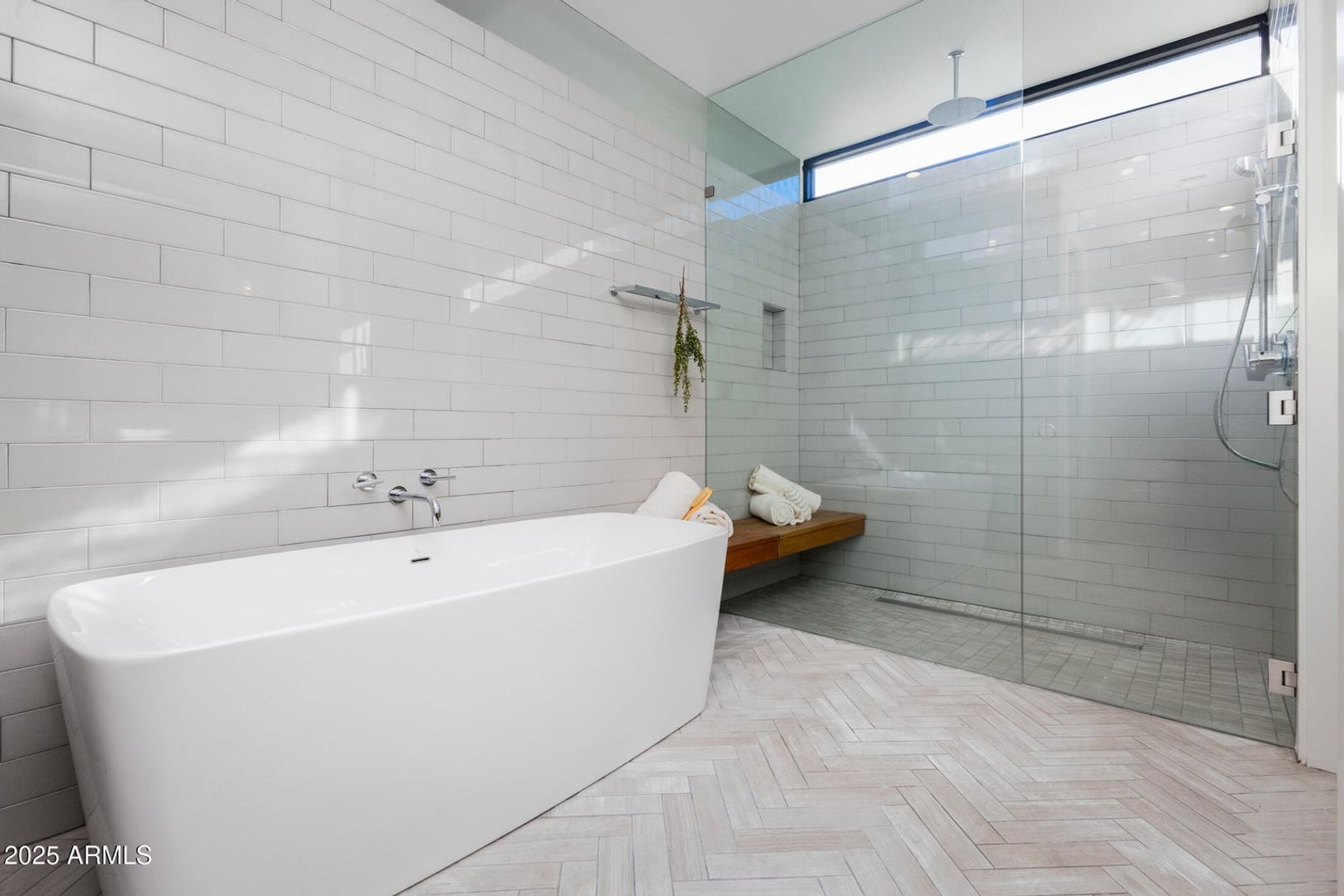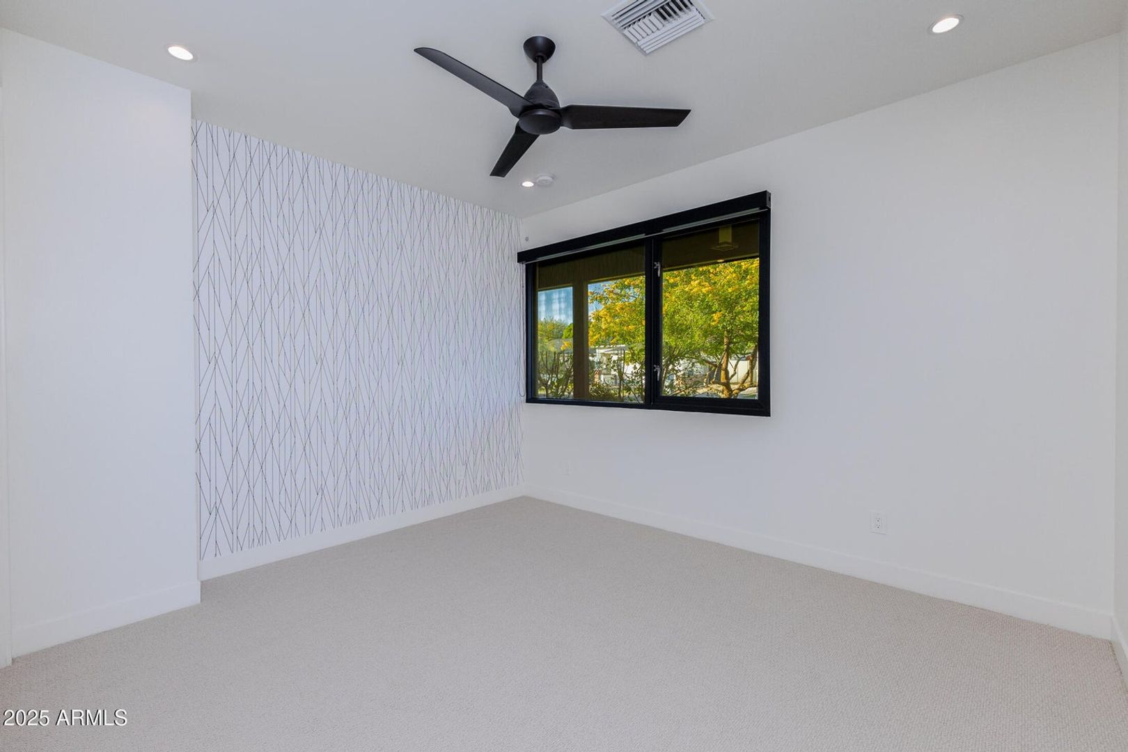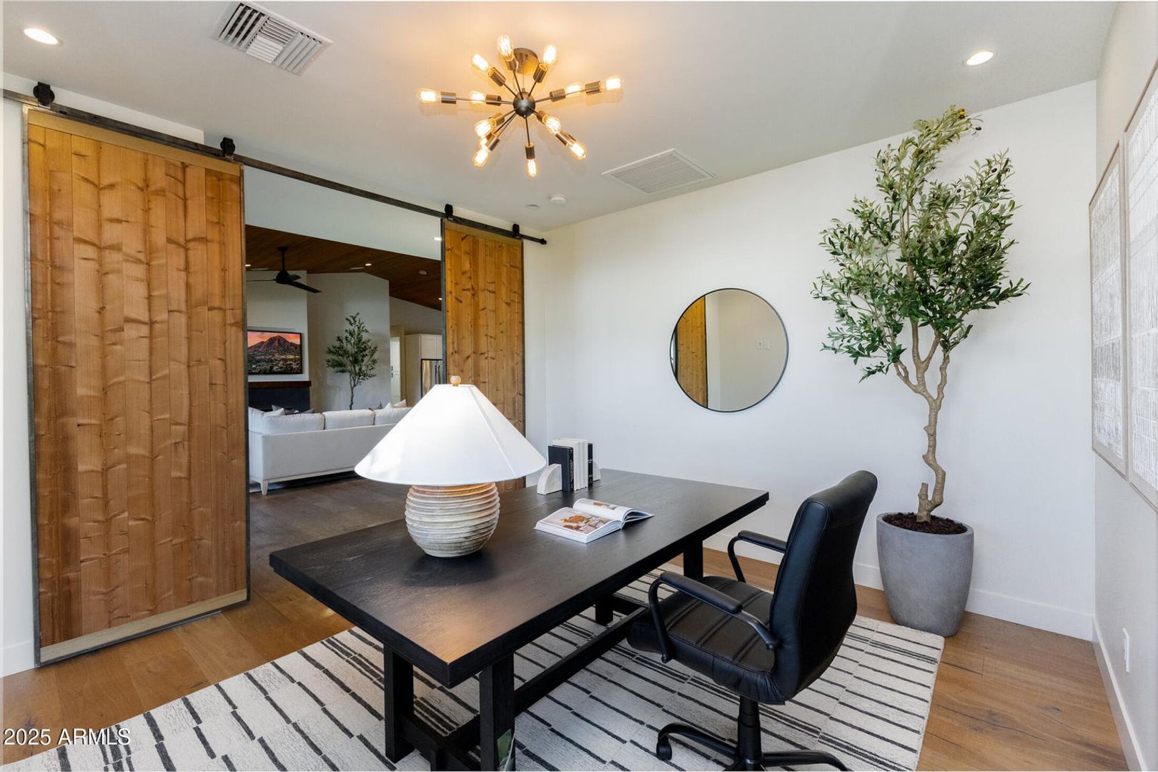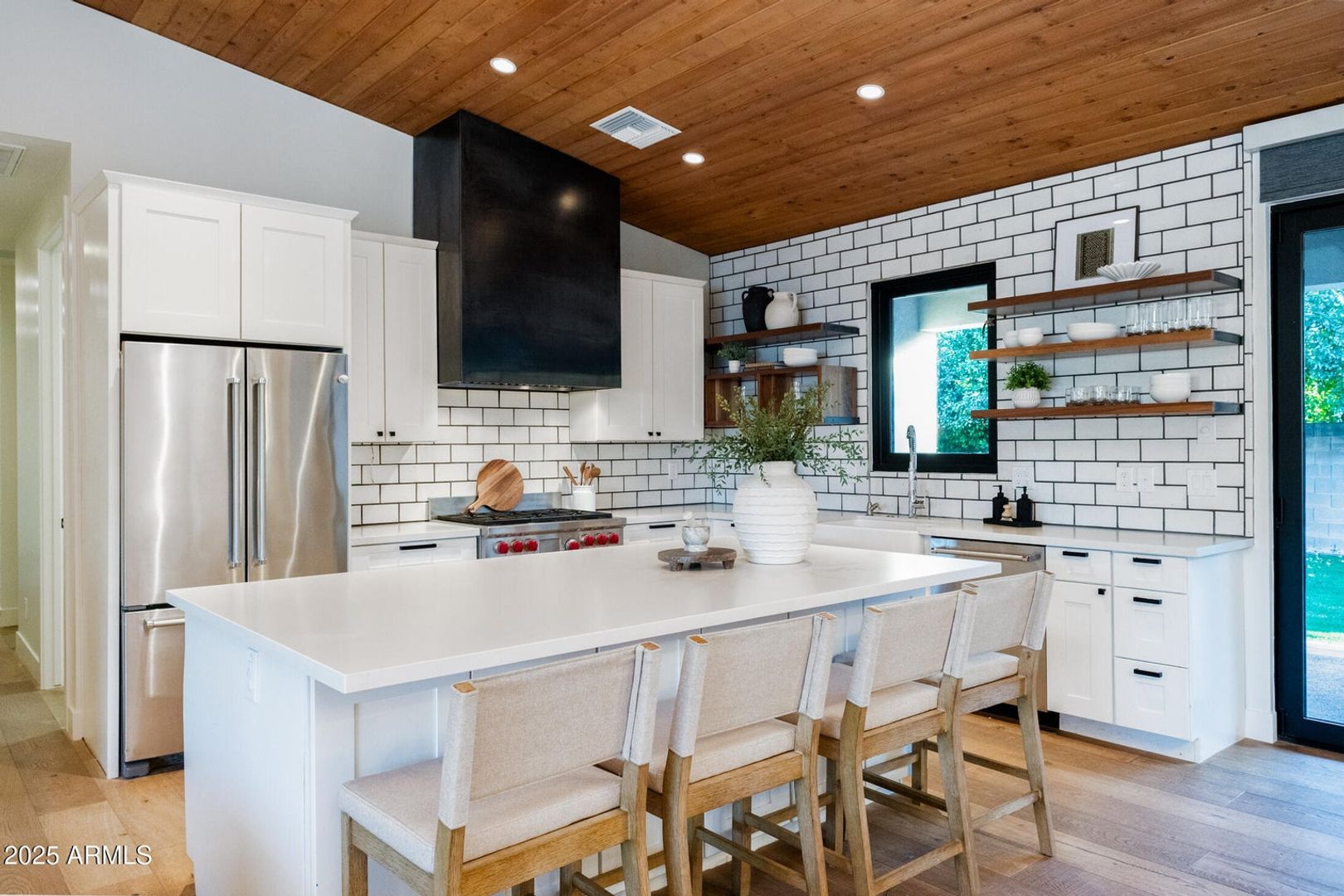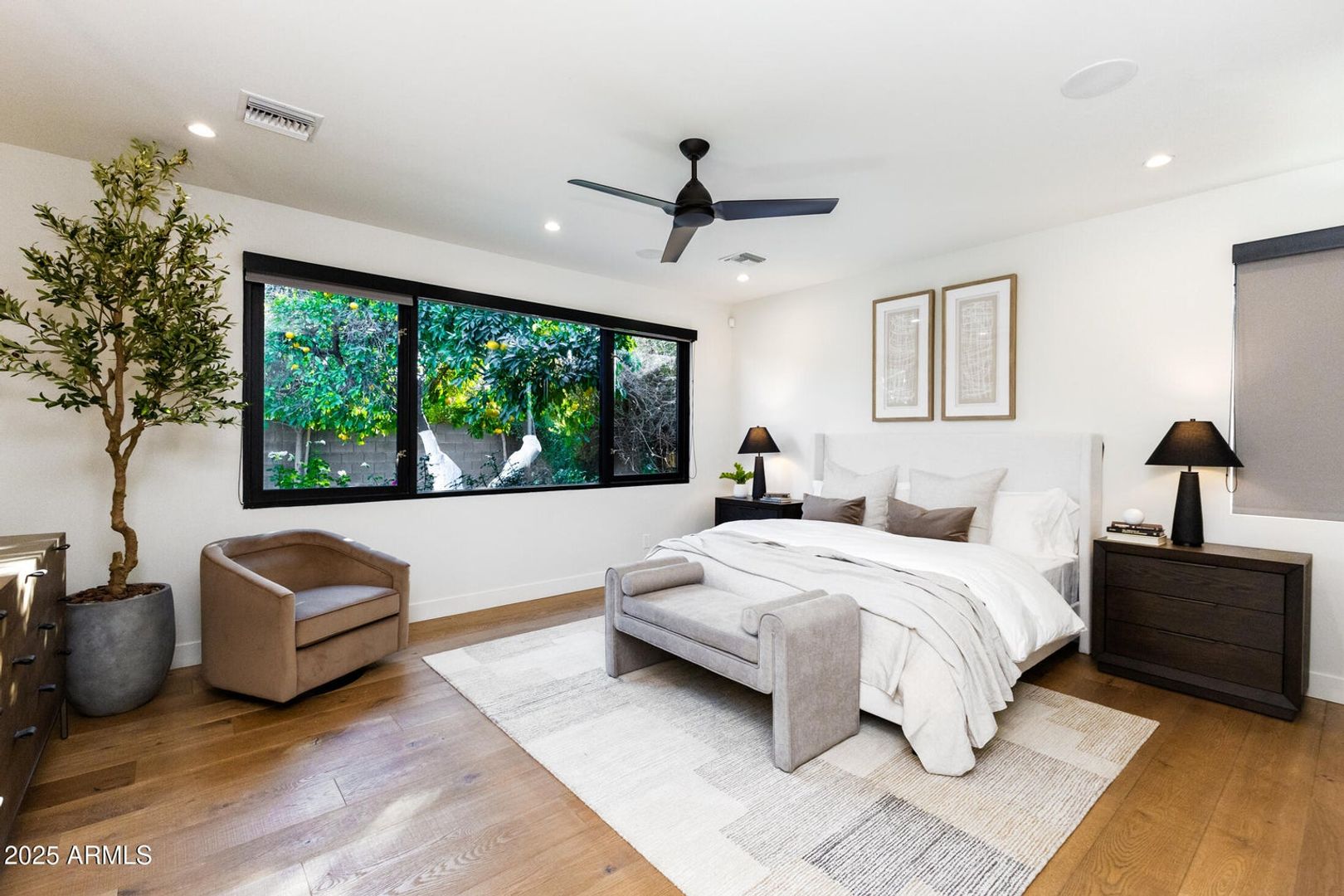 Nestled in the vibrant Camelback Corridor, this stunning 2,855 square-foot custom home, built in 2015, offers unparalleled access to the Valley's finest dining, shopping, and outdoor adventures. This four-bedroom, three-bathroom residence, complete with a dedicated gym and separate office/den, blends modern elegance with functional design. Step inside to discover an open-concept layout with soaring rough-sawn tongue-and-groove ceilings, wide-plank oak floors, and a cozy gas fireplace, creating an inviting ambiance perfect for both intimate gatherings and lively entertaining. The gourmet kitchen, a chef's dream, boasts custom cabinetry, a premium Wolf gas range, and a spacious island that effortlessly connects to the living area, ideal for seamless modern living. The master suite is a serene retreat, featuring a luxurious en-suite bathroom with a soaking tub, walk-in shower, dual vanities, and custom solid walnut cabinetry paired with premium Grohe fixtures for a touch of timeless sophistication. Designed with energy efficiency in mind, the home features a sleek metal roof with foam insulation for durability and low maintenance. Outside, backyard is perfect for soaking up Arizona's sunshine or hosting memorable gatherings. This meticulously crafted home combines style, comfort, and practicality in one extraordinary package.