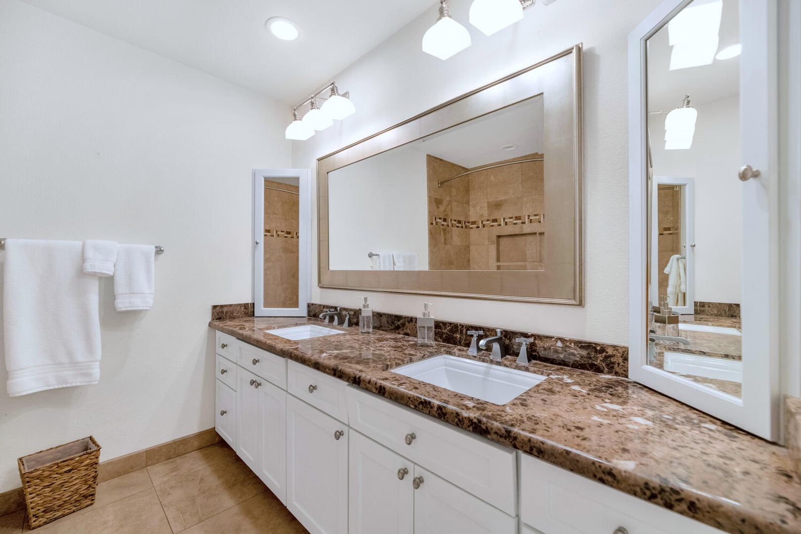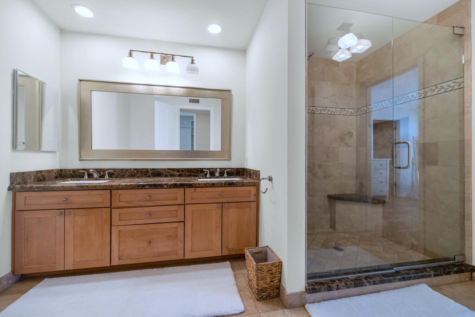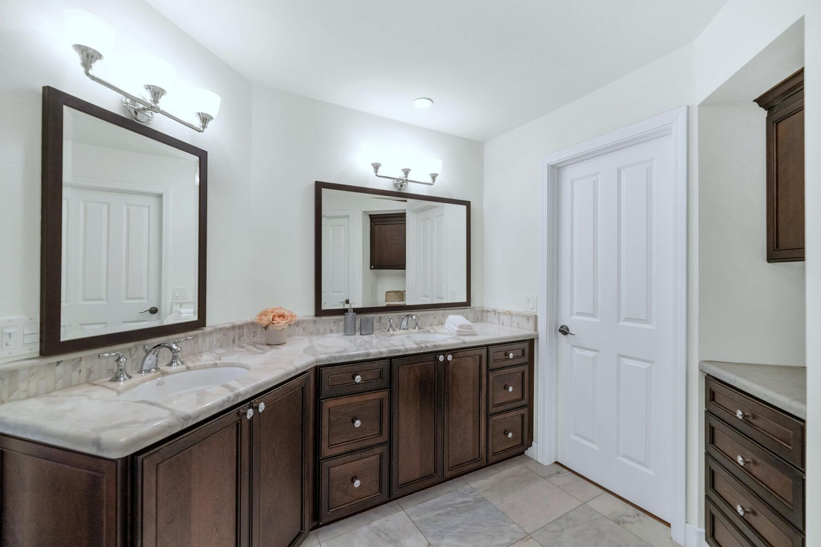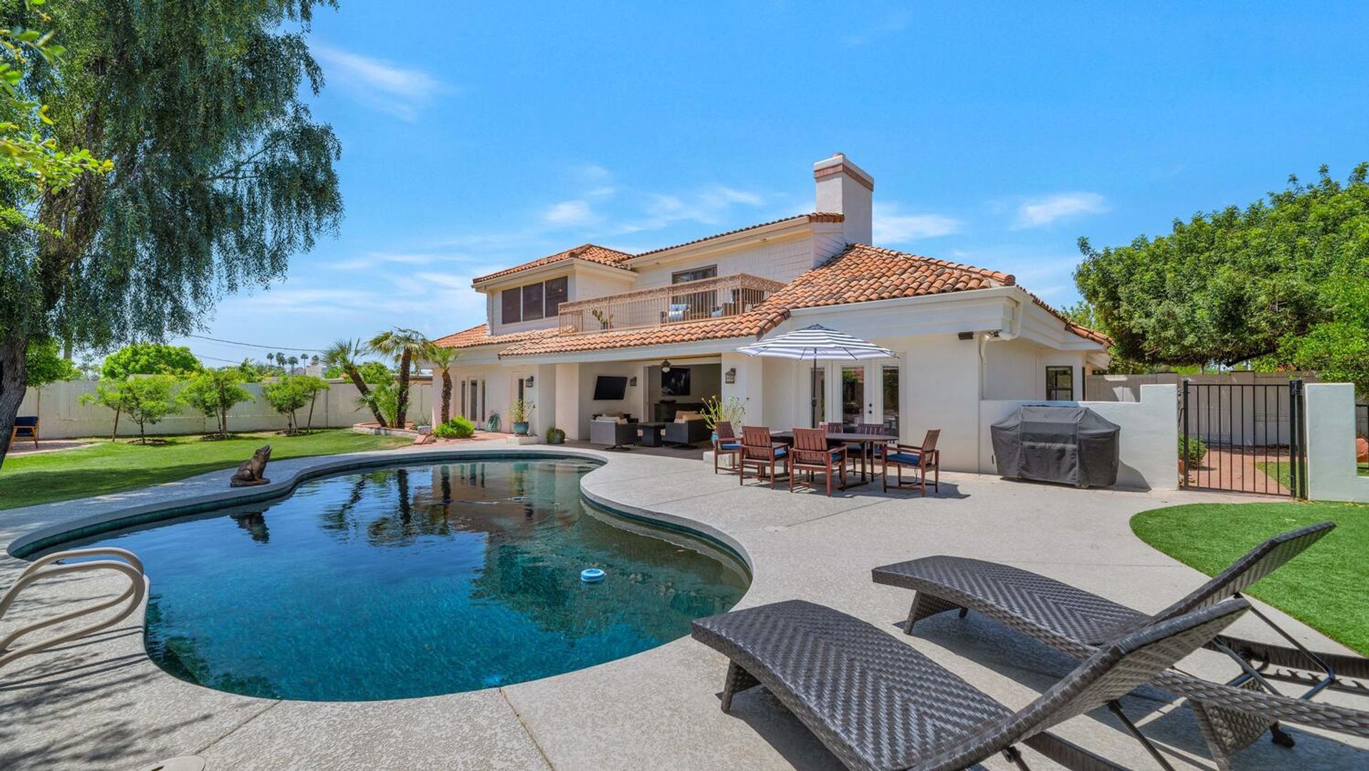 A spiral staircase leads to a remodeled second master suite which includes a private outdoor deck, a living room with a gas fireplace, an office, His and Hers closets and a gorgeous bathroom with marble countertops and flooring and beautiful custom cabinetry. Take in exquisite views of Camelback Mountain from the large grassy backyard while you are relaxing in your sparkling pebble tec swimming pool.