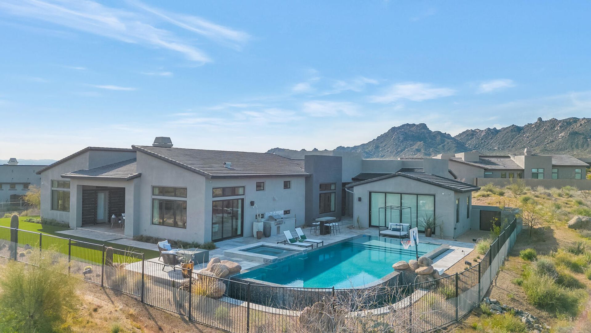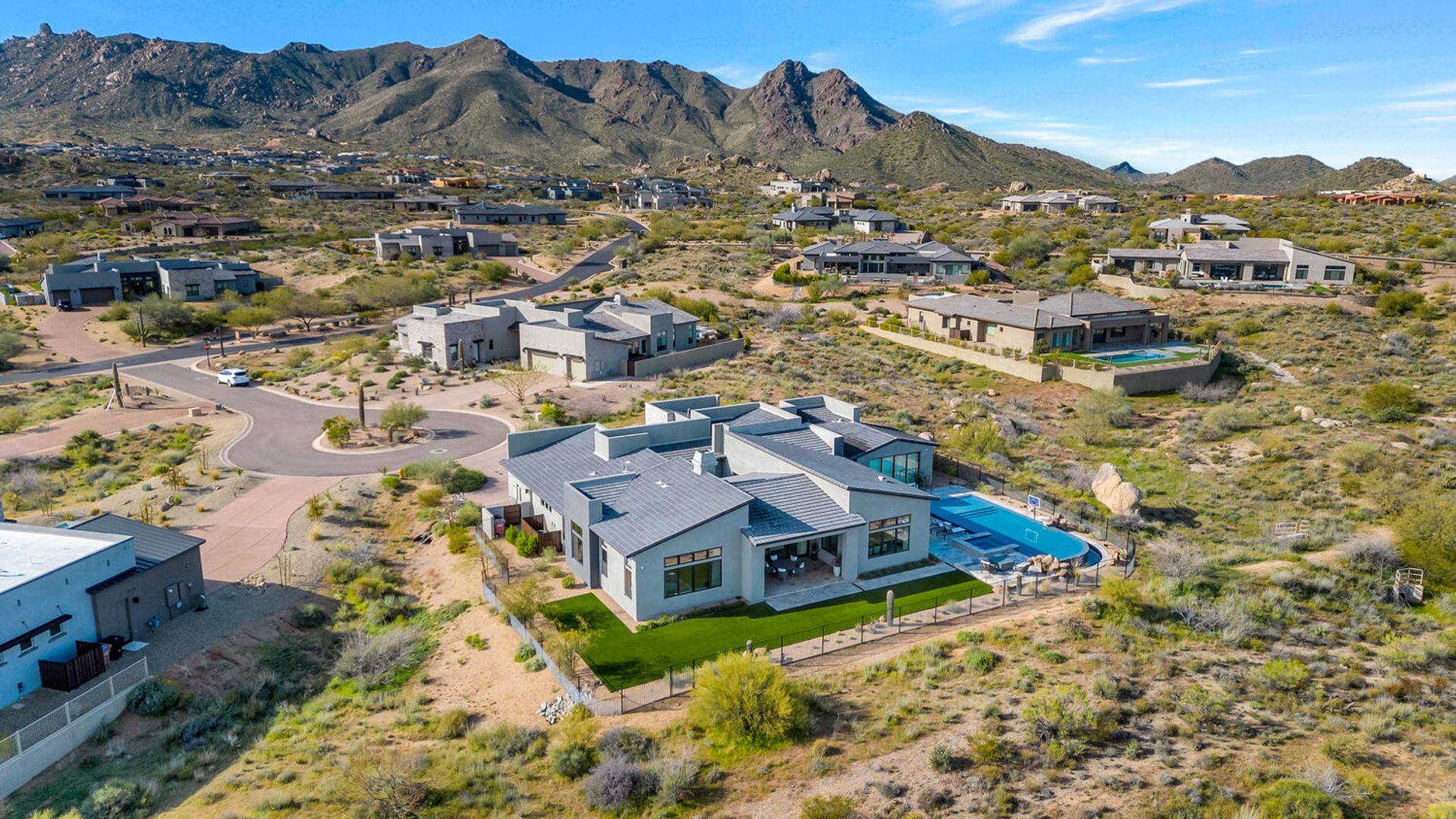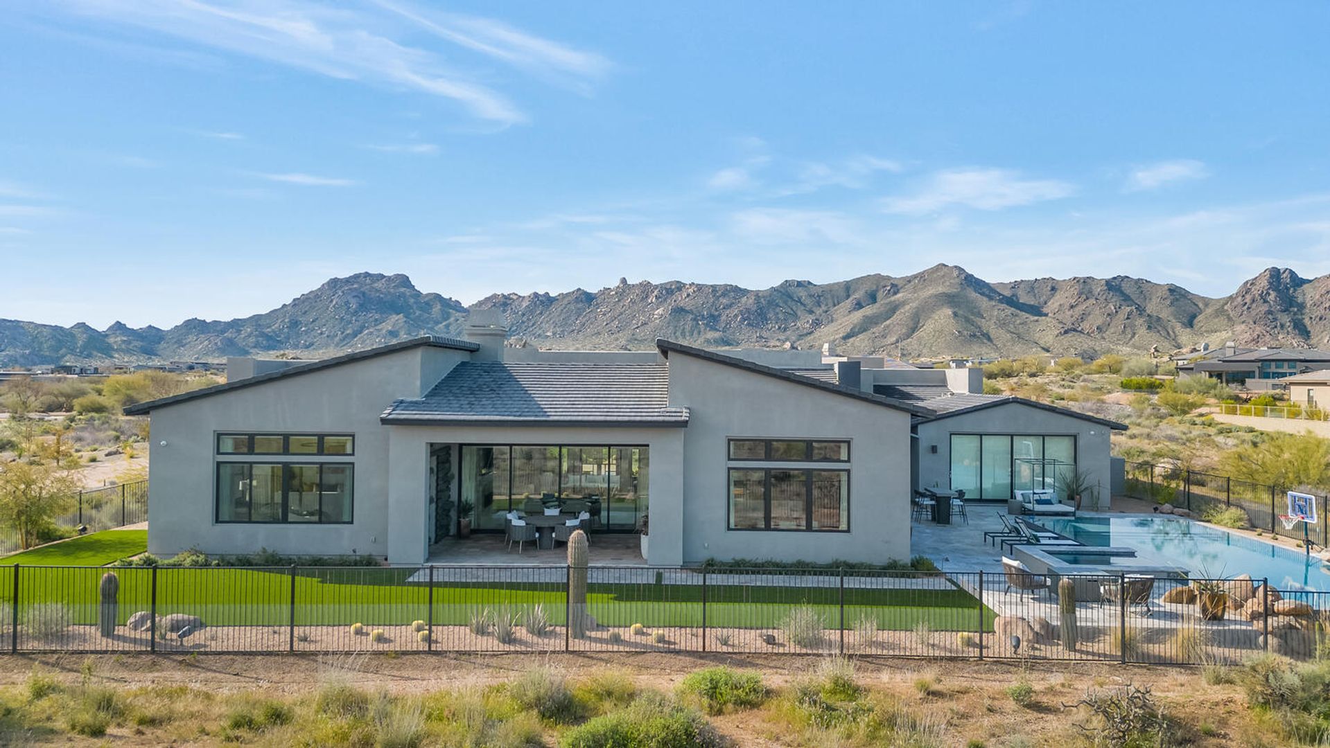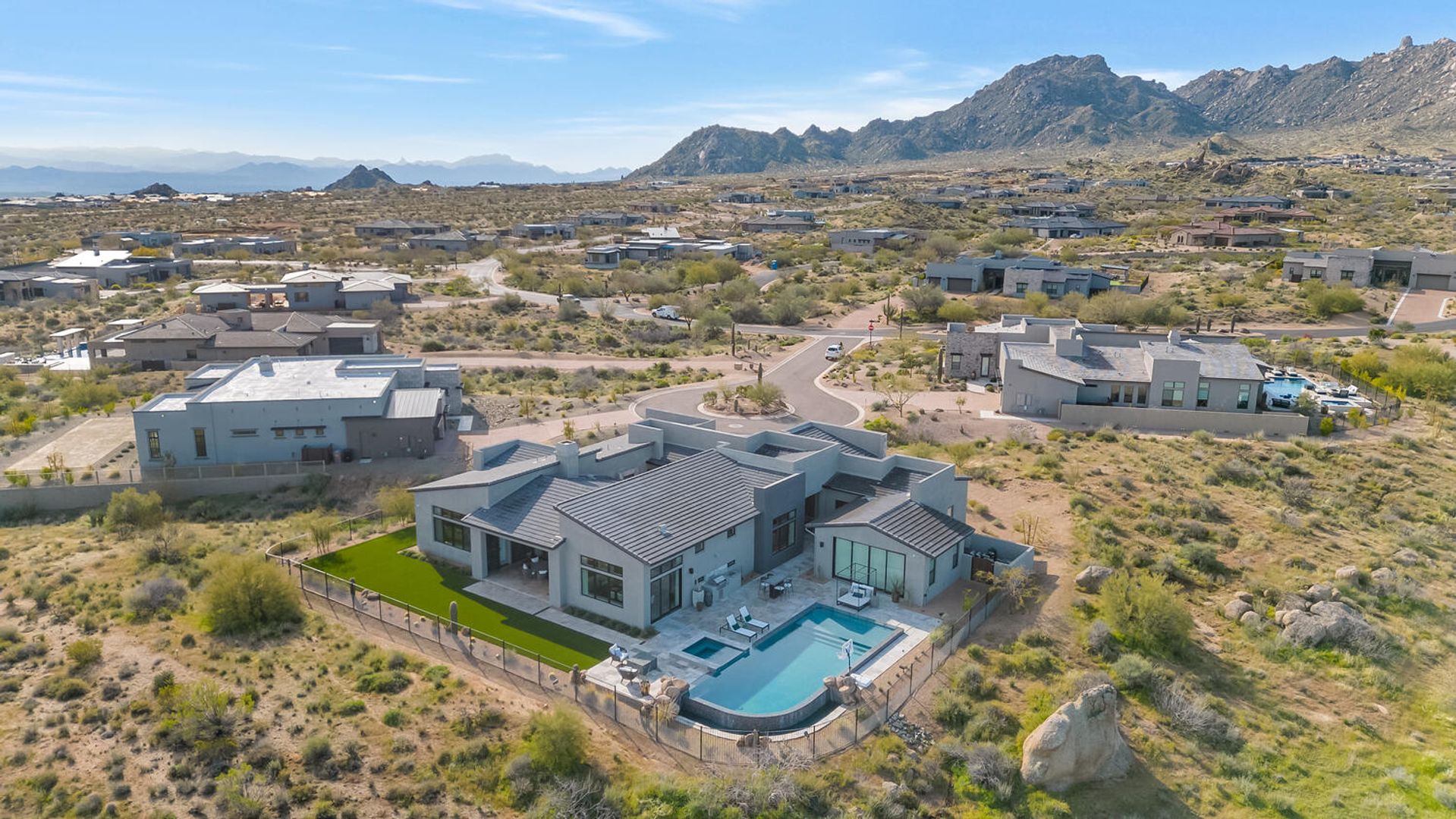 Nestled within the prestigious, guard-gated enclave of Sereno Canyon in North Scottsdale, this contemporary single-level residence embodies the pinnacle of modern desert luxury. Dramatically framed by the iconic McDowell Mountains and enveloped in pristine Sonoran Desert vistas, the home masterfully fuses sleek architectural lines with timeless elegance, offering a peaceful sanctuary mere moments from Scottsdale's premier dining, upscale shopping, and championship golf courses. Upon entry, soaring ceilings and walls of expansive glass dissolve boundaries between indoors and out, bathing the open-concept living spaces in abundant natural light. The expansive great room effortlessly transitions into a state-of-the-art chef's kitchen, complete with premium appliances, custom cabinetry, and a substantial island perfect for seamless entertaining. Versatile living and dining areas accommodate everything from lavish gatherings to quiet, intimate evenings. The luxurious master suite serves as a private oasis, boasting spa-like finishes, dual vanities, and generous walk-in closet space. Additional guest bedrooms, along with adaptable flex rooms, provide ample comfort and versatility—ideal for family, guests, or a sophisticated home office. Outdoors, resort-style living reaches new heights with a shimmering pool, integrated spa, and expansive covered patios crafted for year-round enjoyment amid Arizona's glorious climate. Residents enjoy exclusive access to Sereno Canyon's acclaimed Mountain House Lodge amenities, including a state-of-the-art fitness center, resort pools, spa services, clubhouse, and more—delivering an elevated lifestyle immersed in natural beauty.