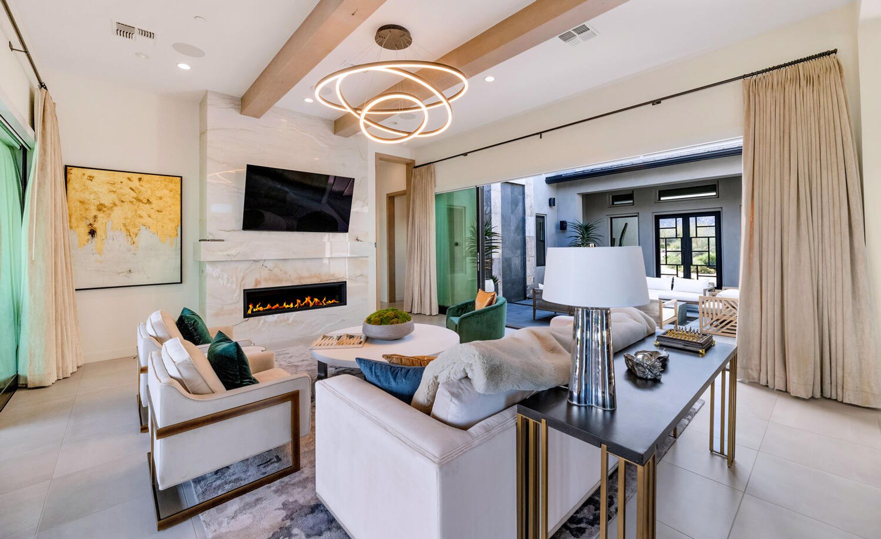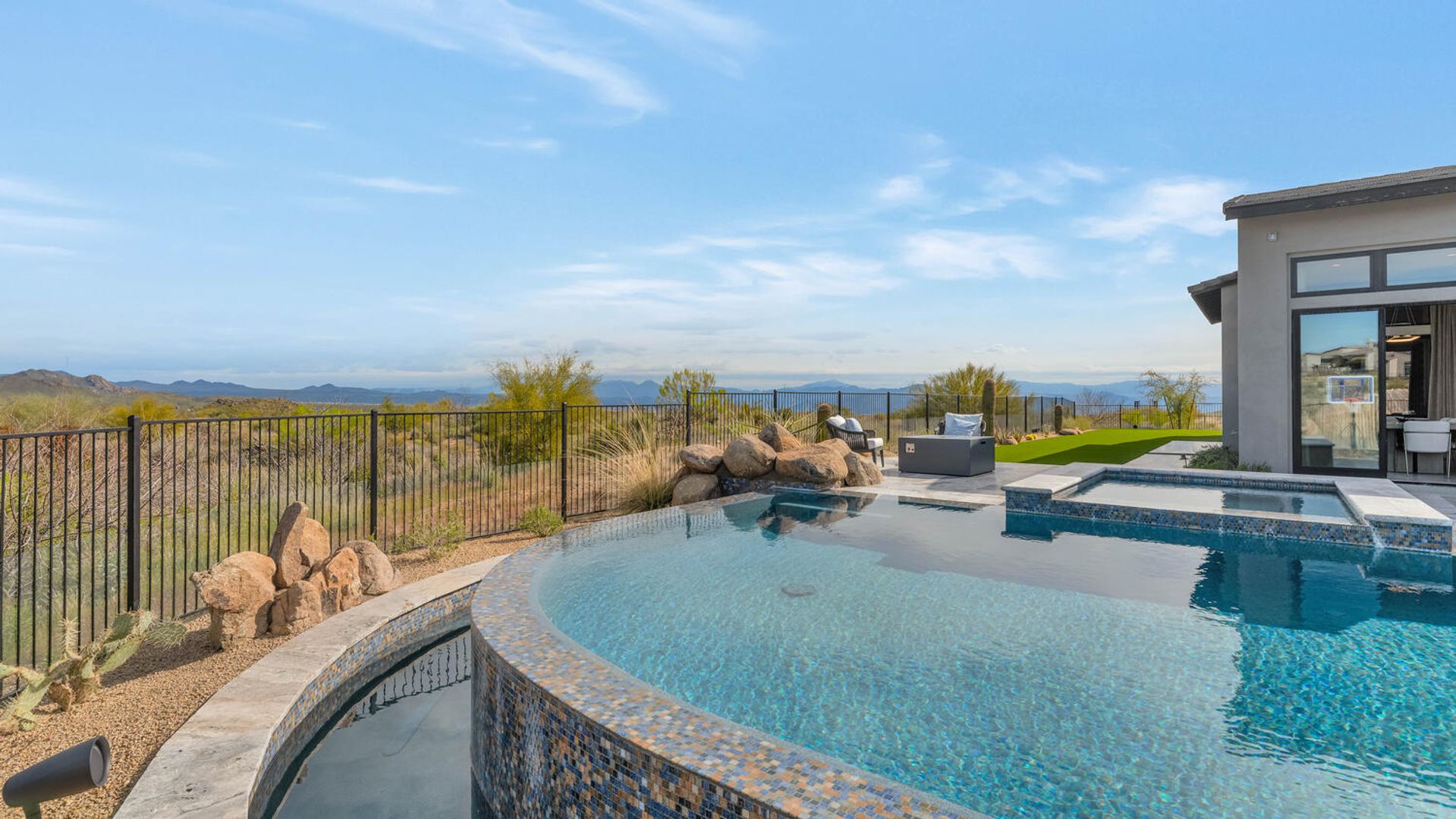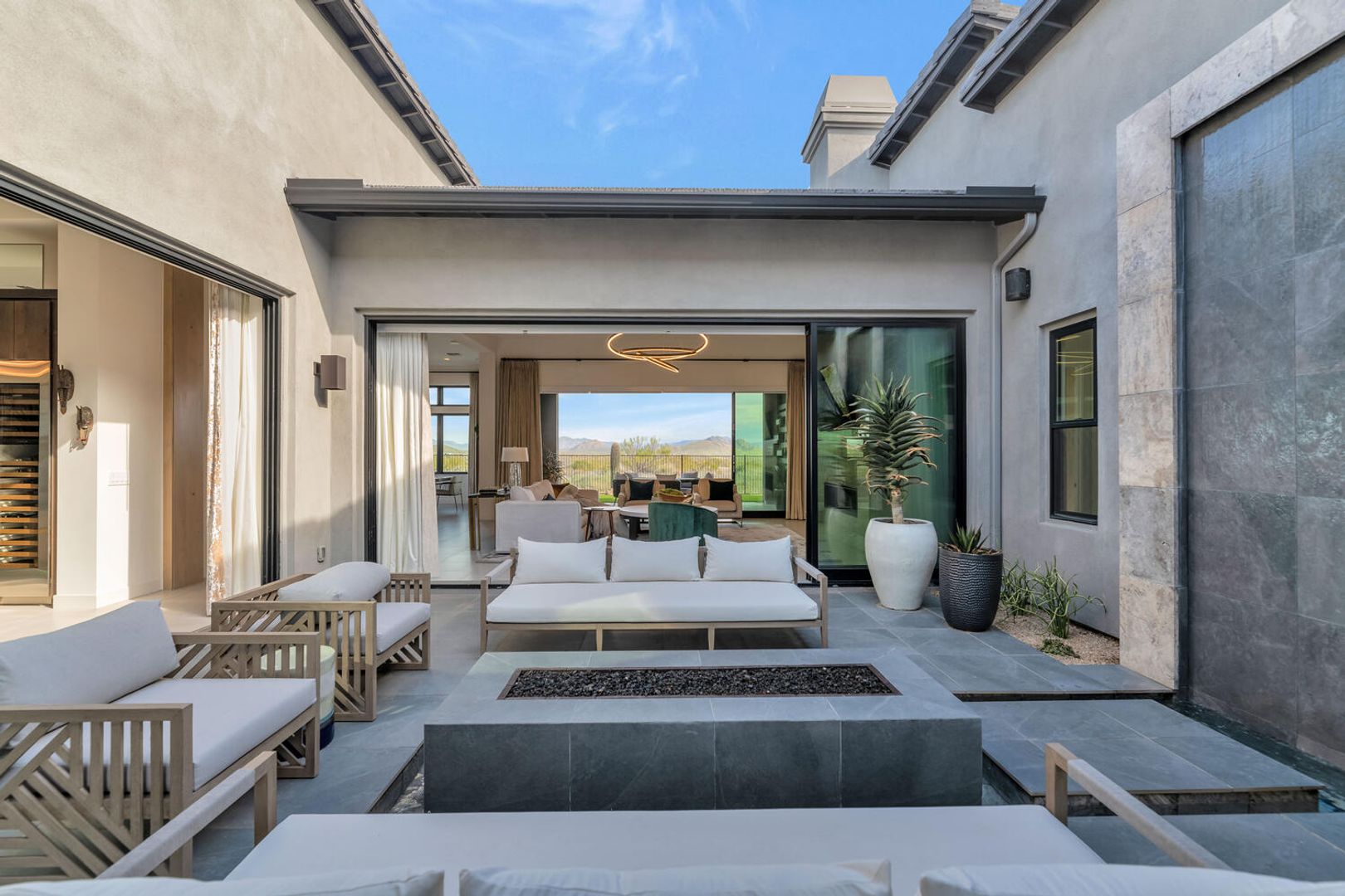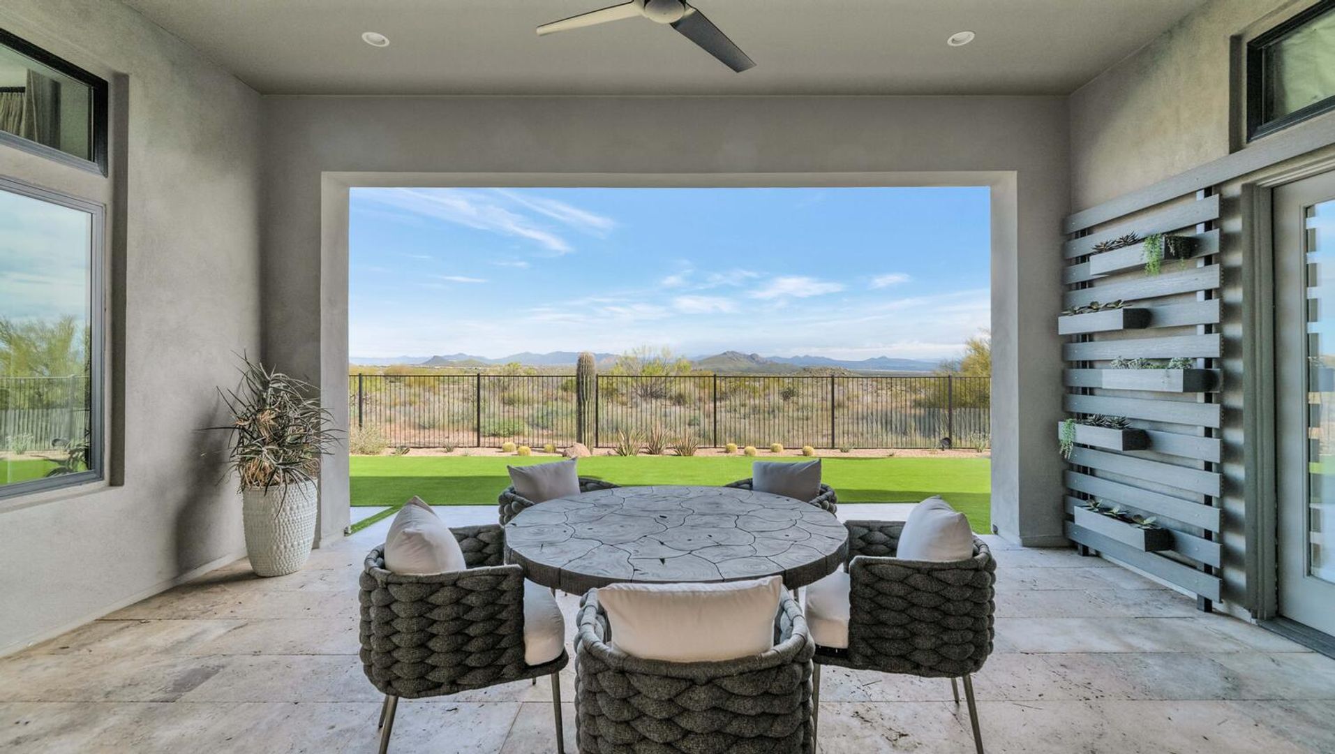Nestled within the prestigious, guard-gated enclave of Sereno Canyon in North Scottsdale, this contemporary single-level residence embodies the pinnacle of modern desert luxury. Dramatically framed by the iconic McDowell Mountains and enveloped in pristine Sonoran Desert vistas, the home masterfully fuses sleek architectural lines with timeless elegance, offering a peaceful sanctuary mere moments from Scottsdale's premier dining, upscale shopping, and championship golf courses. Upon entry, soaring ceilings and walls of expansive glass dissolve boundaries between indoors and out, bathing the open-concept living spaces in abundant natural light. The expansive great room effortlessly transitions into a state-of-the-art chef's kitchen, complete with premium appliances, custom cabinetry, and a substantial island perfect for seamless entertaining. Versatile living and dining areas accommodate everything from lavish gatherings to quiet, intimate evenings. The luxurious master suite serves as a private oasis, boasting spa-like finishes, dual vanities, and generous walk-in closet space. Additional guest bedrooms, along with adaptable flex rooms, provide ample comfort and versatility—ideal for family, guests, or a sophisticated home office. Outdoors, resort-style living reaches new heights with a shimmering pool, integrated spa, and expansive covered patios crafted for year-round enjoyment amid Arizona's glorious climate. Residents enjoy exclusive access to Sereno Canyon's acclaimed Mountain House Lodge amenities, including a state-of-the-art fitness center, resort pools, spa services, clubhouse, and more—delivering an elevated lifestyle immersed in natural beauty.
