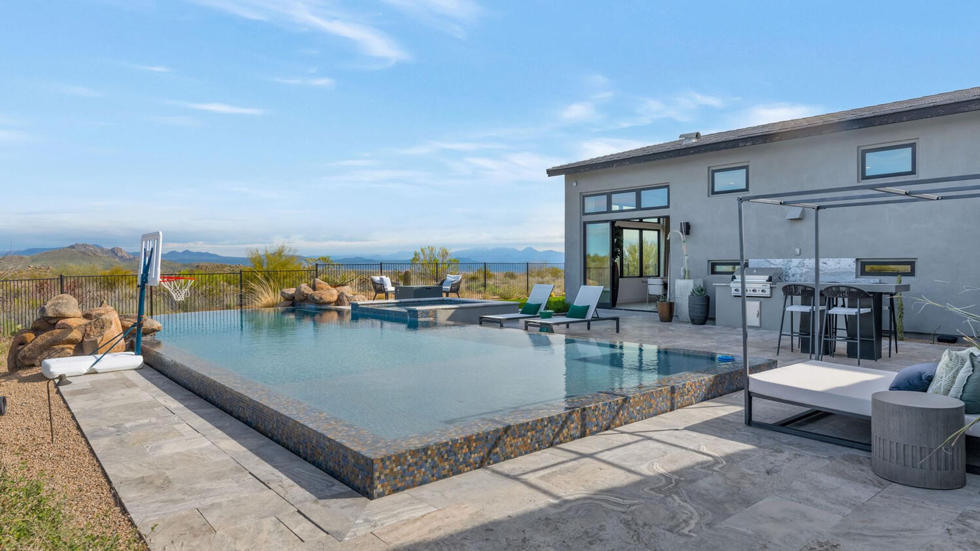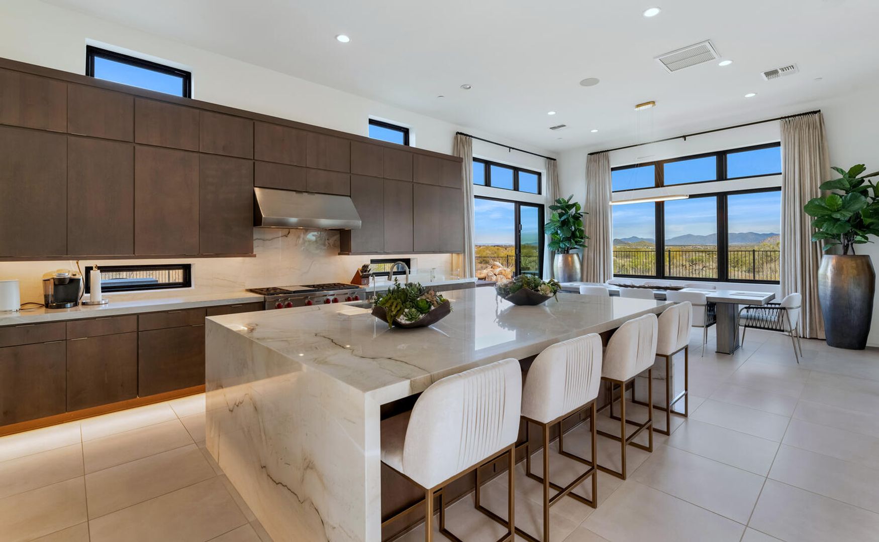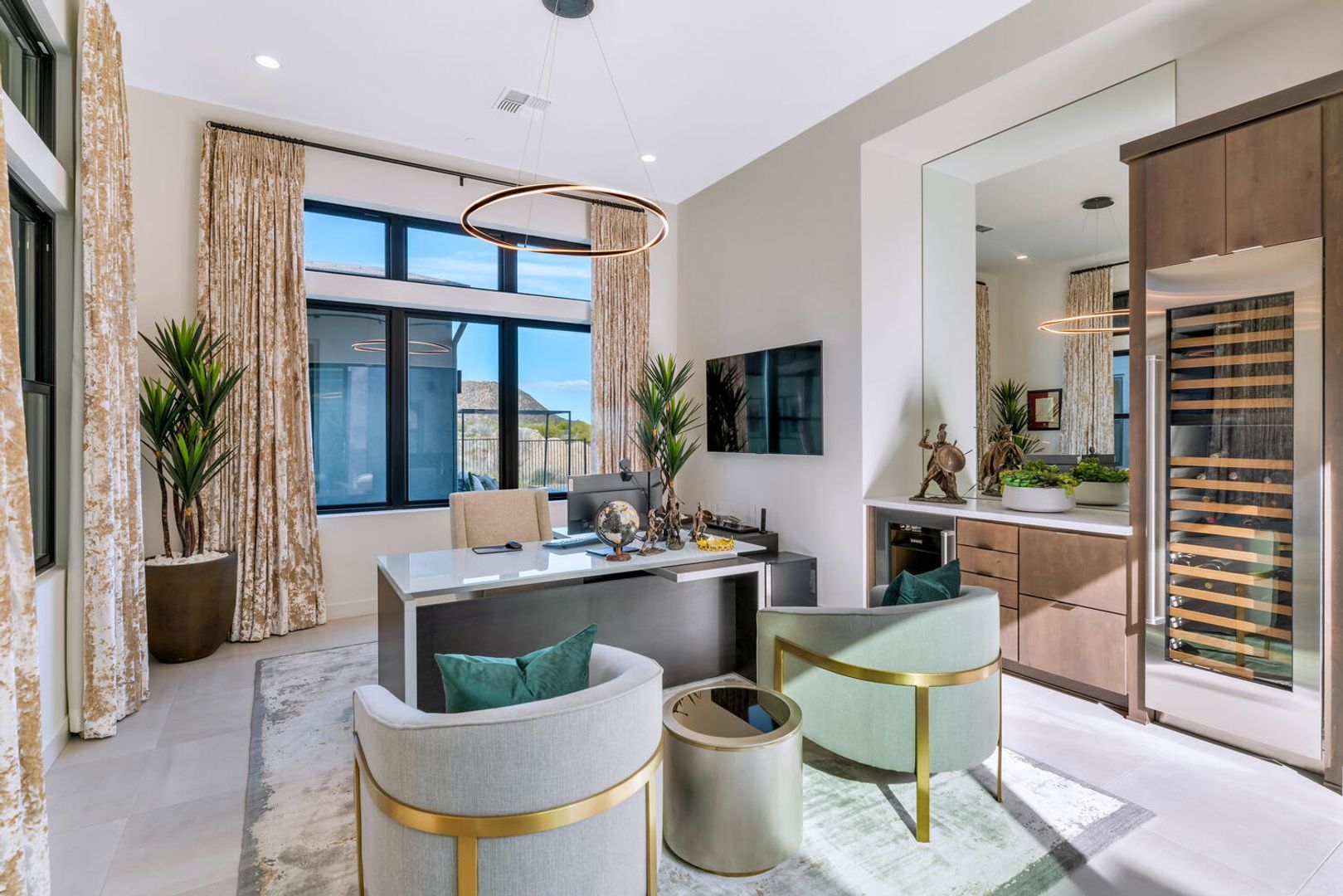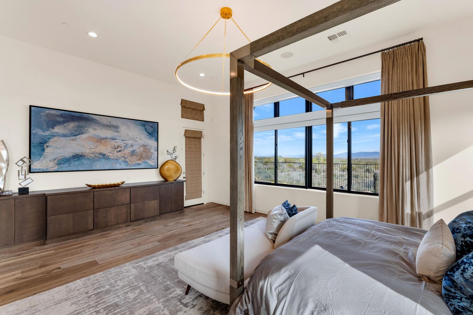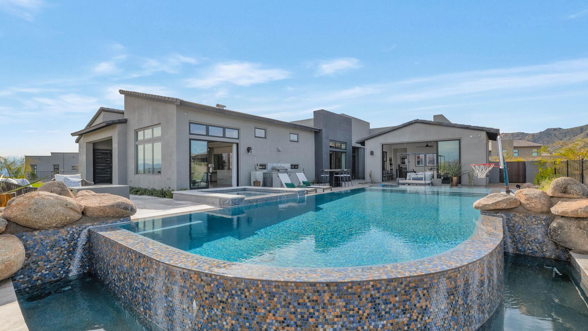 Nestled within the prestigious, guard-gated enclave of Sereno Canyon in North Scottsdale, this contemporary single-level residence embodies the pinnacle of modern desert luxury. Dramatically framed by the iconic McDowell Mountains and enveloped in pristine Sonoran Desert vistas, the home masterfully fuses sleek architectural lines with timeless elegance, offering a peaceful sanctuary mere moments from Scottsdale's premier dining, upscale shopping, and championship golf courses. Upon entry, soaring ceilings and walls of expansive glass dissolve boundaries between indoors and out, bathing the open-concept living spaces in abundant natural light. The expansive great room effortlessly transitions into a state-of-the-art chef's kitchen, complete with premium appliances, custom cabinetry, and a substantial island perfect for seamless entertaining. Versatile living and dining areas accommodate everything from lavish gatherings to quiet, intimate evenings. The luxurious master suite serves as a private oasis, boasting spa-like finishes, dual vanities, and generous walk-in closet space. Additional guest bedrooms, along with adaptable flex rooms, provide ample comfort and versatility—ideal for family, guests, or a sophisticated home office. Outdoors, resort-style living reaches new heights with a shimmering pool, integrated spa, and expansive covered patios crafted for year-round enjoyment amid Arizona's glorious climate. Residents enjoy exclusive access to Sereno Canyon's acclaimed Mountain House Lodge amenities, including a state-of-the-art fitness center, resort pools, spa services, clubhouse, and more—delivering an elevated lifestyle immersed in natural beauty.