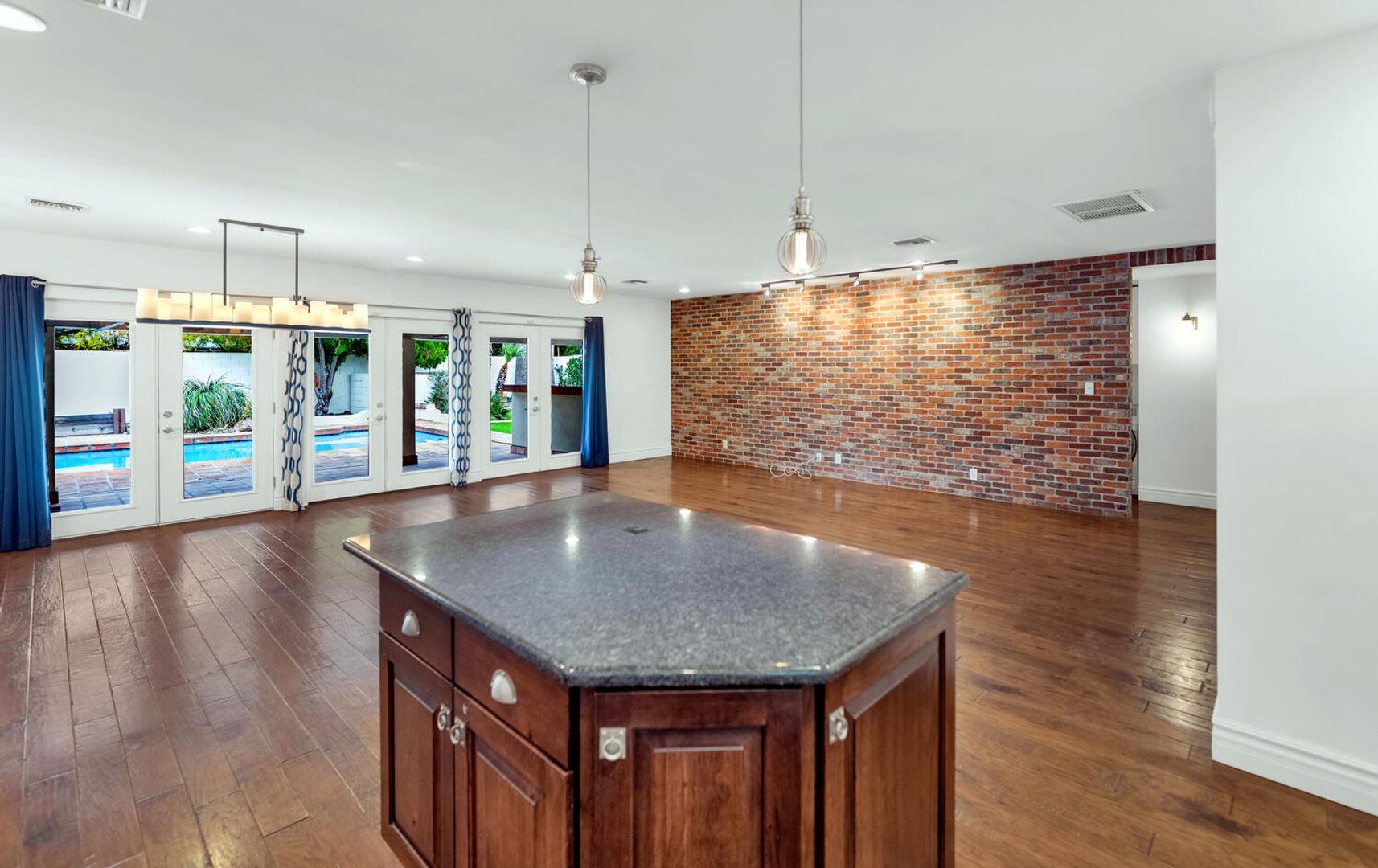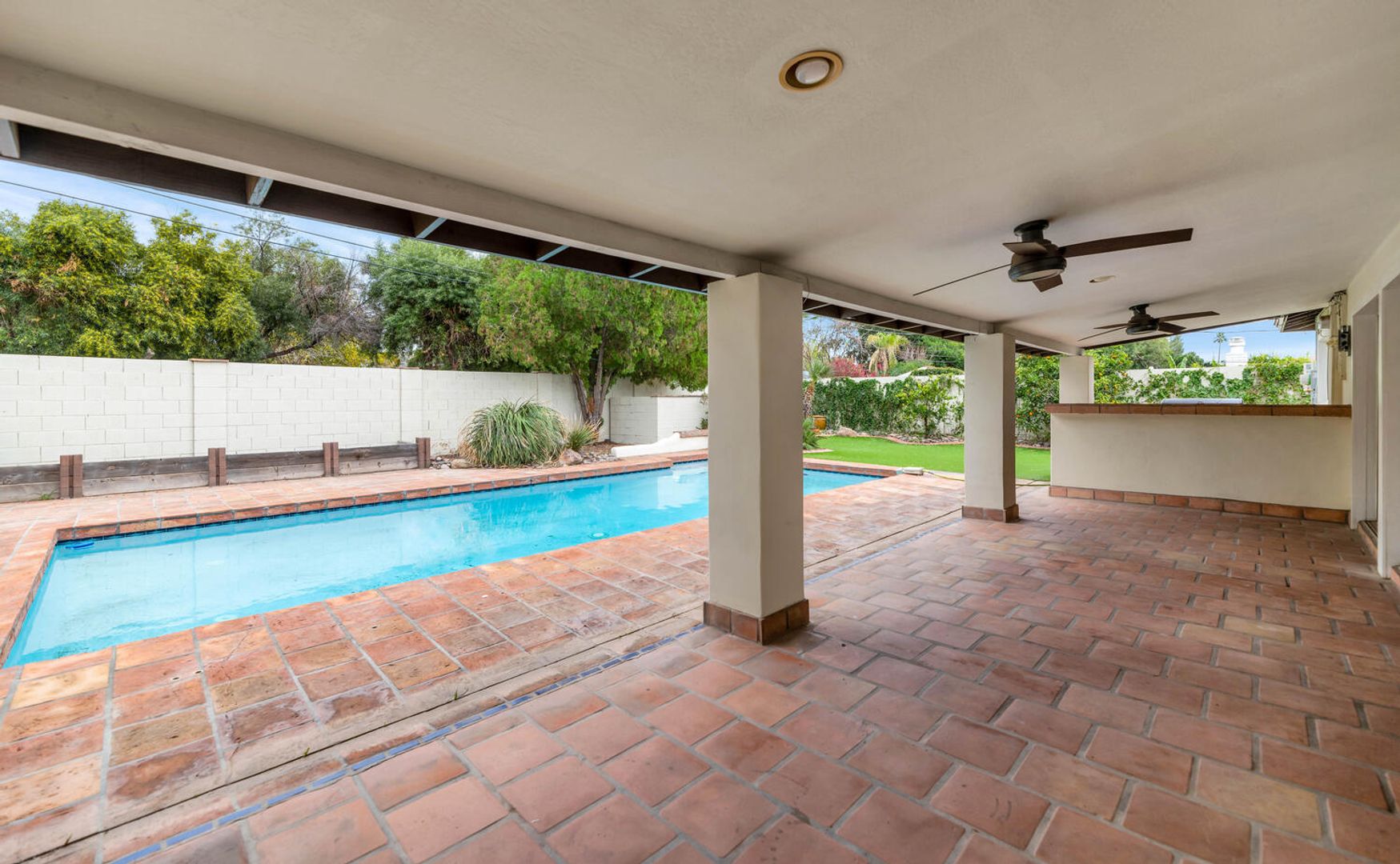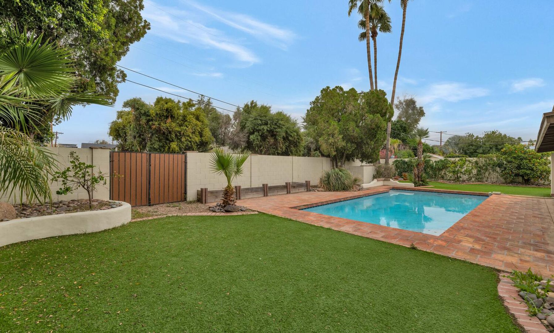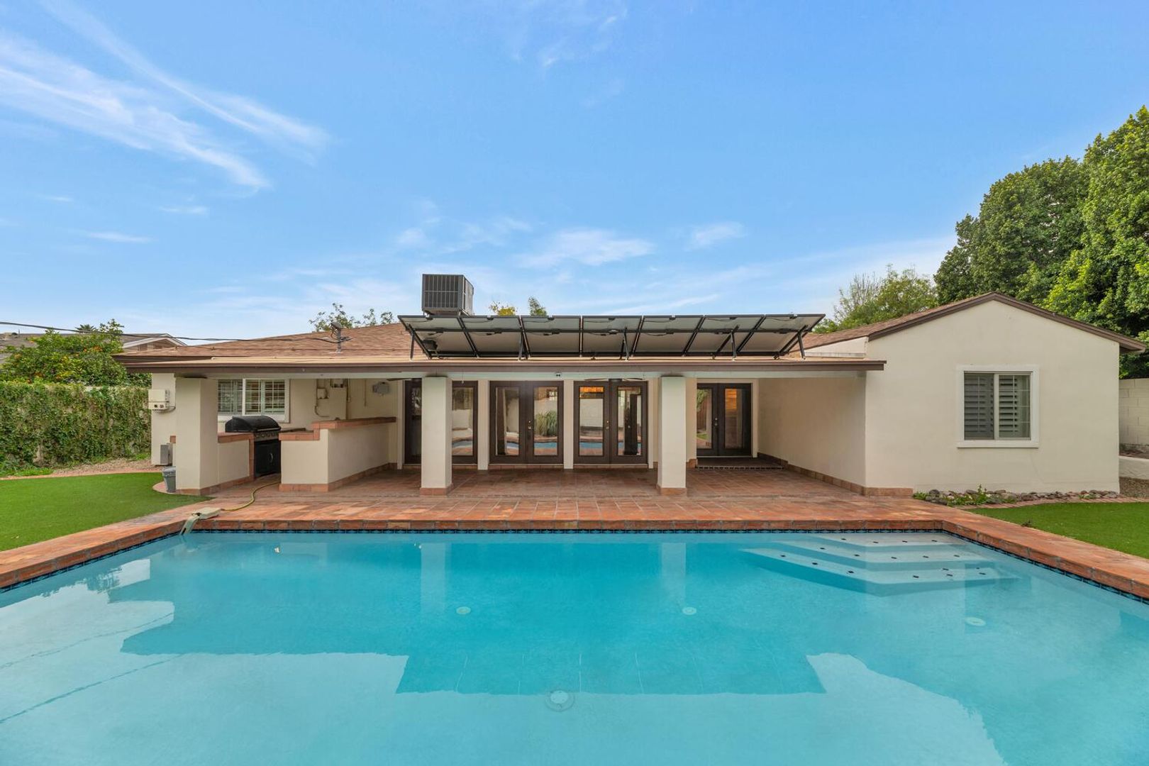 Discover your private oasis in the heart of Phoenix! This exquisite single-level luxury residence is enveloped by lush, manicured landscaping, creating an inviting retreat from the moment you arrive. Step inside to a gourmet kitchen designed for the inspired chef, featuring a spacious center island, elegant granite countertops, and premium stainless steel appliances. The open living area captivates with a built-in 200-bottle wine cellar, perfect for entertaining or unwinding in style. Retreat to the expansive master suite, warm wood flooring, and private French doors open directly to the backyard paradise. The spa-like ensuite bath indulges with a double-sink vanity, deep Roman soaking tub, invigorating steam shower, and a generous walk-in closet. Outside, the beautifully designed backyard beckons with a covered patio, sparkling pool for refreshing dips, built-in BBQ for al fresco dining, and vibrant green grass - your ultimate entertainer's dream. Don't miss this stunning Phoenix gem!